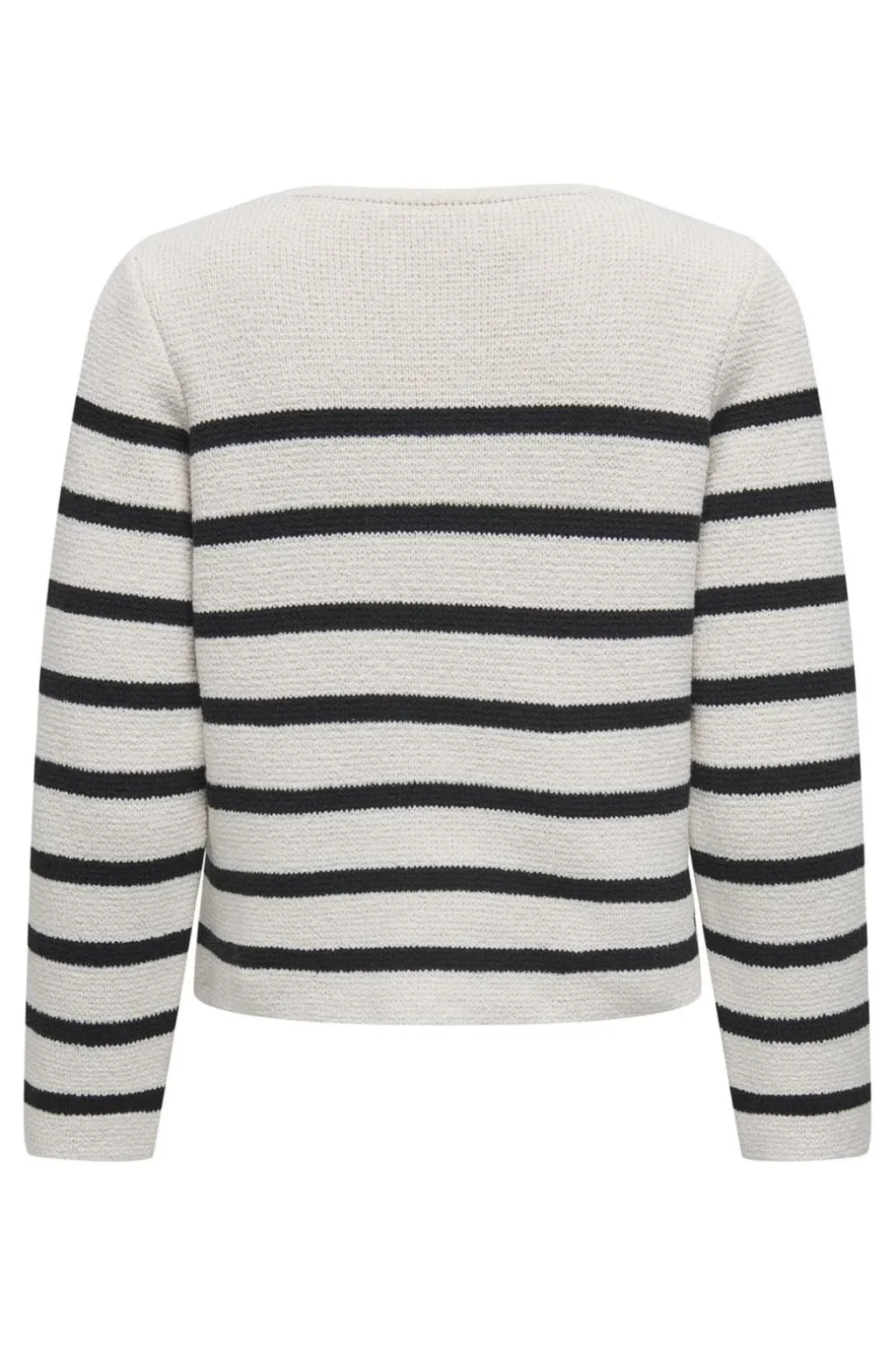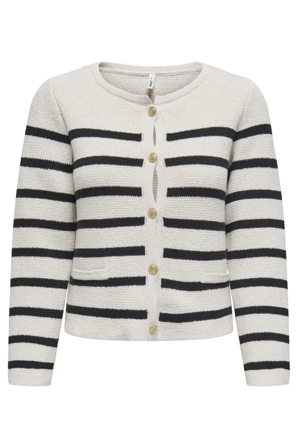 Stribet cardigan fra Only med cremehvide og sorte striber. Den har en rund halsudskæring og knapper foran. Cardiganen er lavet af en blanding af polyester og genanvendt bomuld.