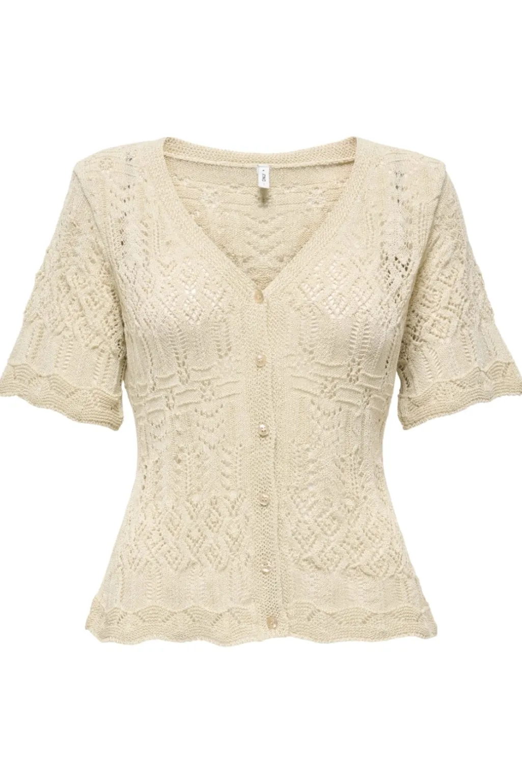 Strikket top fra Only i lys beige med glimmereffekt. Toppen har V-hals, knaplukning foran og korte ærmer. Den er fremstillet i fladstrik med et dekorativt mønster.