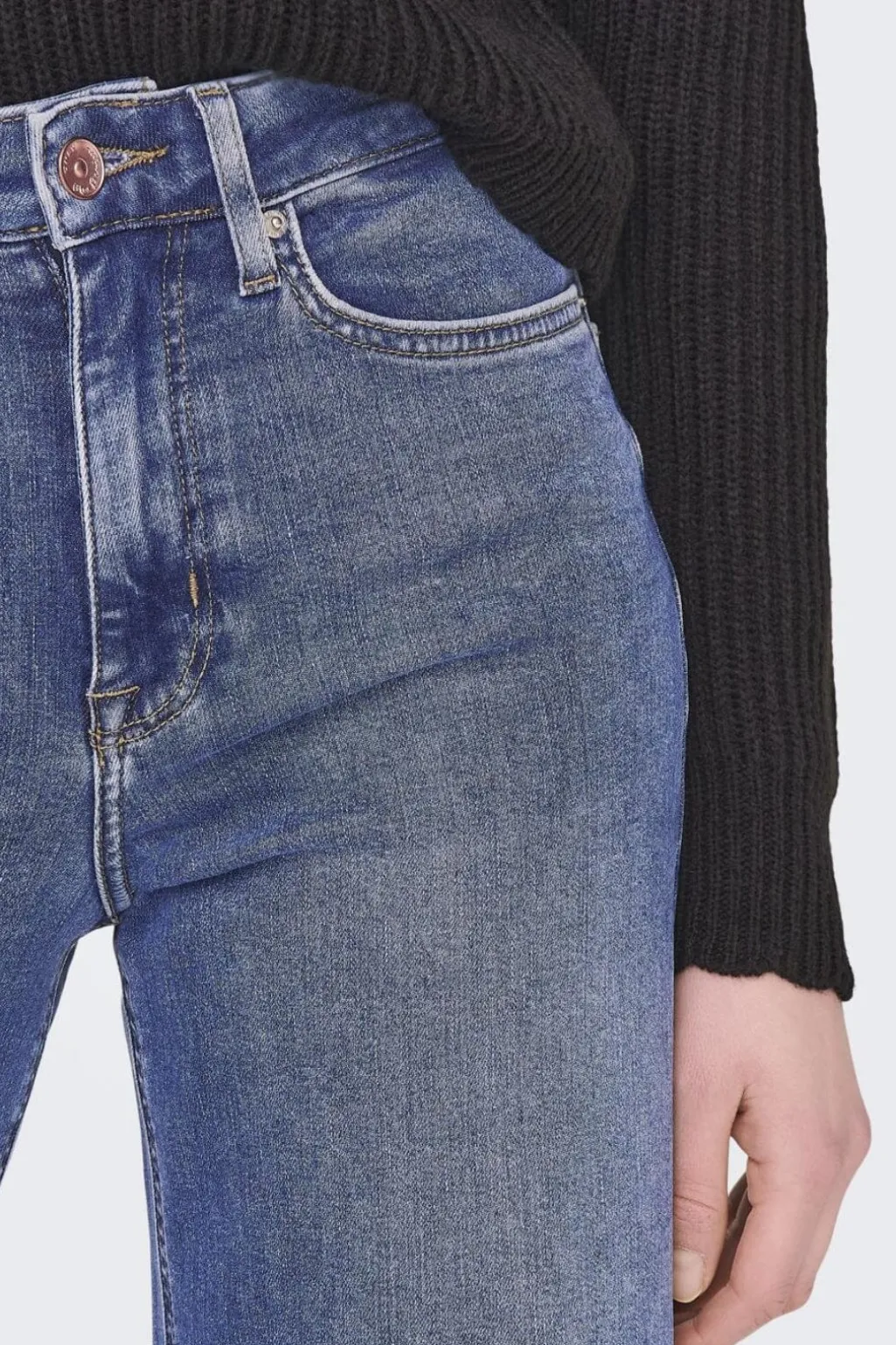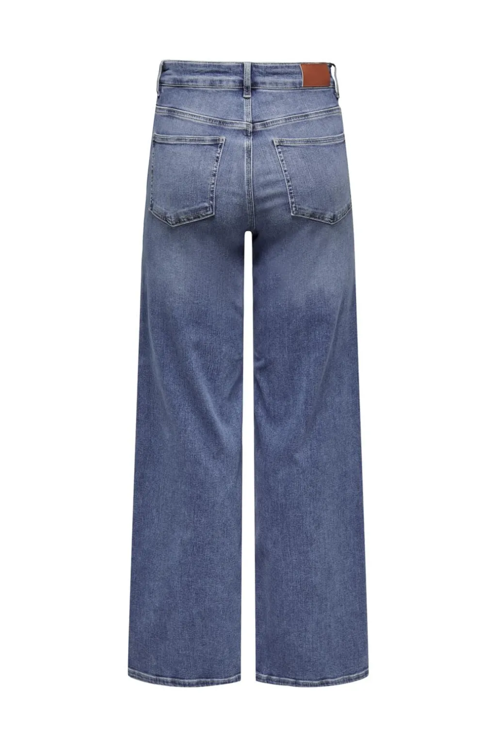 Mellemblå jeans fra Only med høj talje og bæltestropper. Den brede pasform giver god plads fra hofte til ankel, og jeansene har møntlomme og lynlåslukning.