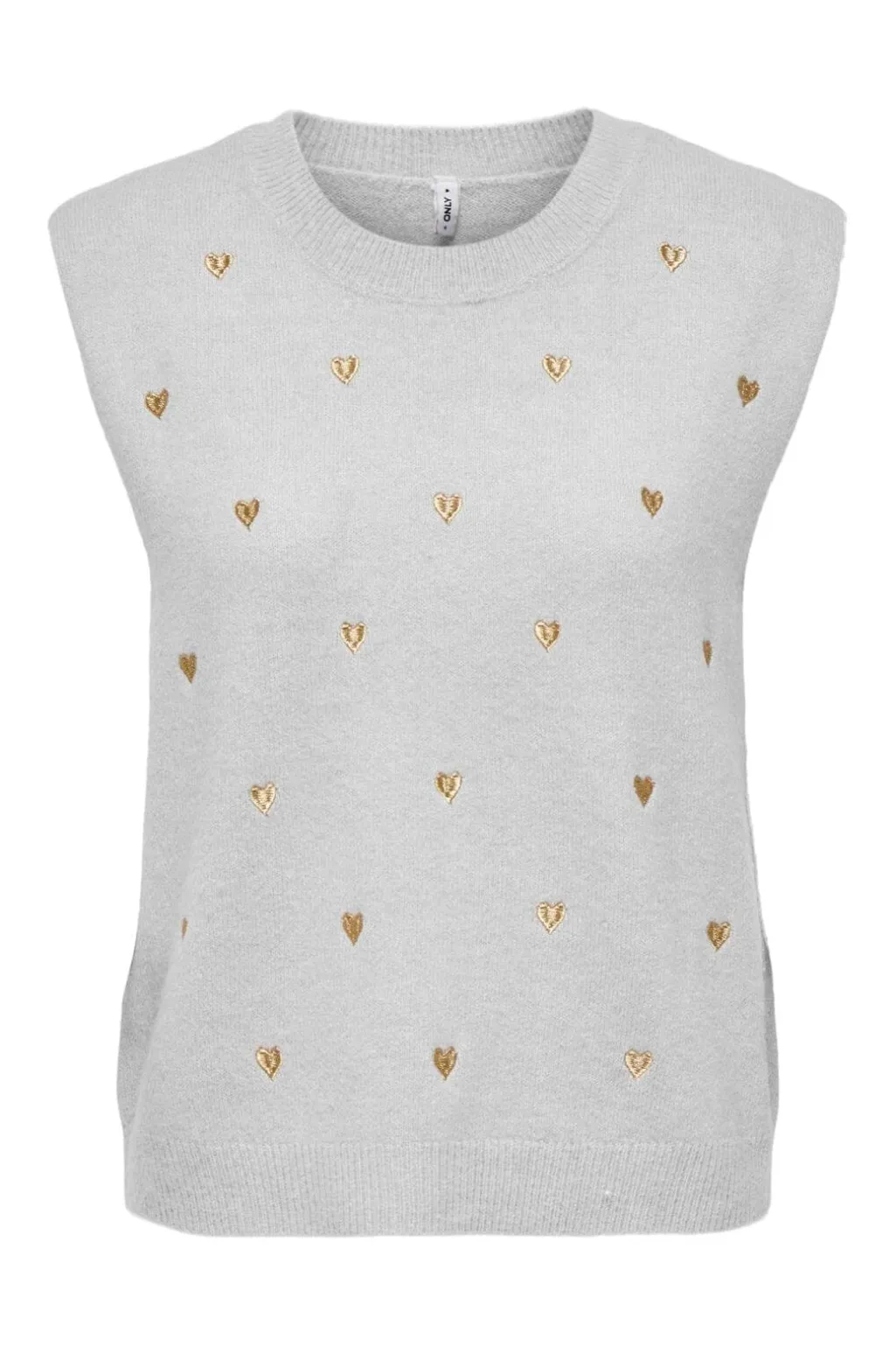 En strikket vest fra Only i lys grå nuance med broderede gyldne hjerter. Vesten har en O-halsudskæring og et ærmeløst design med ribmanchetter.