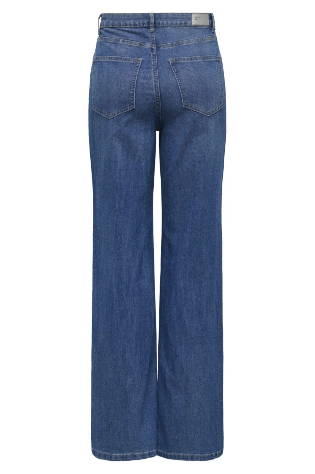 Brede jeans fra Only i mellemblå denim. Den høje talje og det brede ben-design giver jeansene et afslappet udtryk. Lynlås og knapper foran.