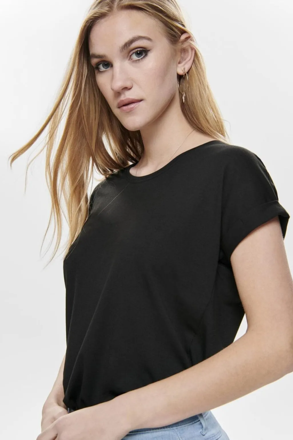 Sort t-shirt fra Only med rund halsudskæring og korte ærmer. T-shirten har en regular fit og er fremstillet i en blød materialekombination med høj andel af viskose.