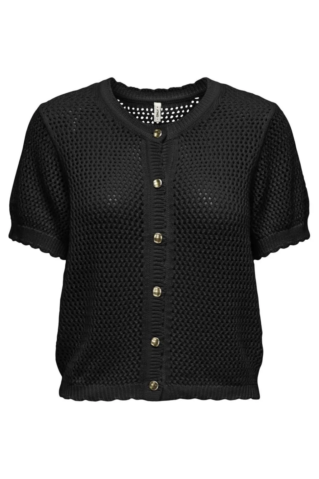Sort cardigan fra Only med struktureret strikdesign og knapper foran. Den har O-halsudskæring og korte ærmer i 2/4 længde.