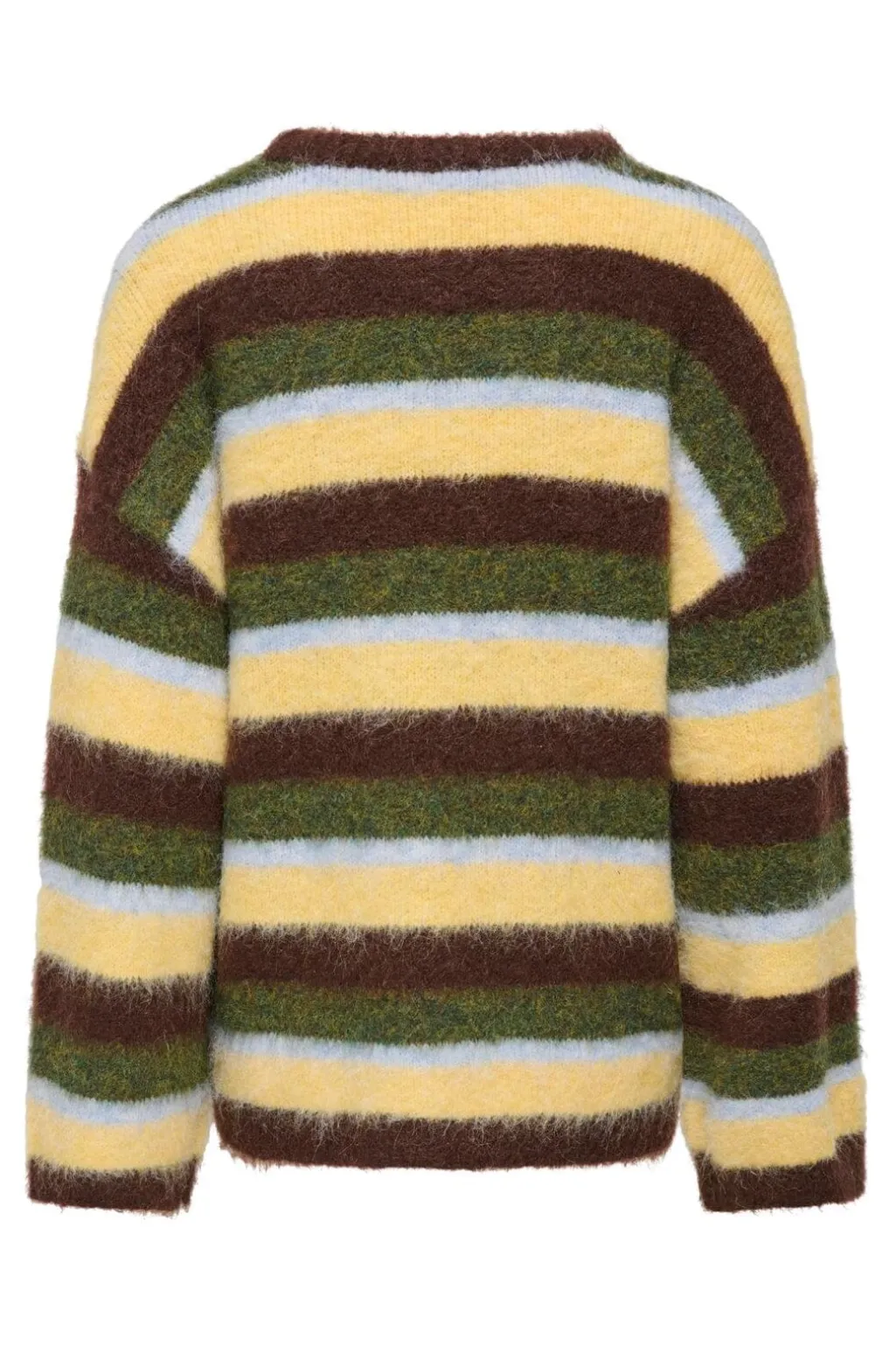 Stribet striktrøje fra Only med vandrette striber i brun, grøn, gul og lyseblå. Striktrøjen har rund halsudskæring og lange ærmer med sænkede skuldersømme.