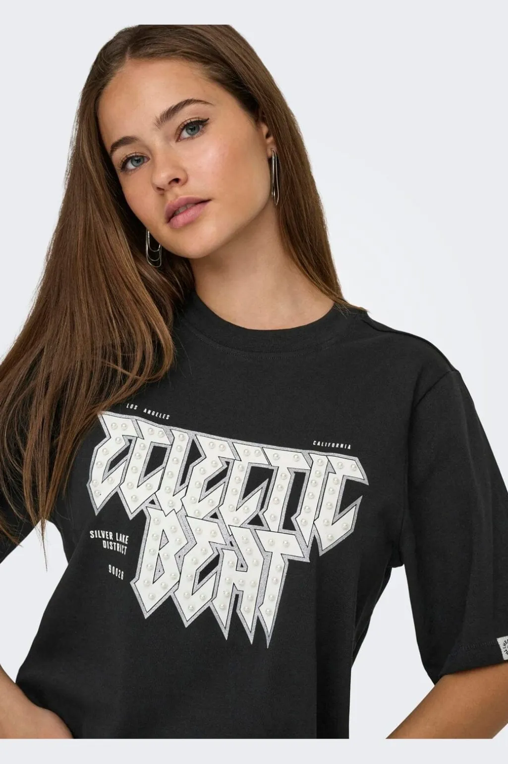 Sort t-shirt fra Only med grafisk Electric Beattryk på forsiden. T-shirten har en løs pasform og rund halsudskæring med perledetaljer.