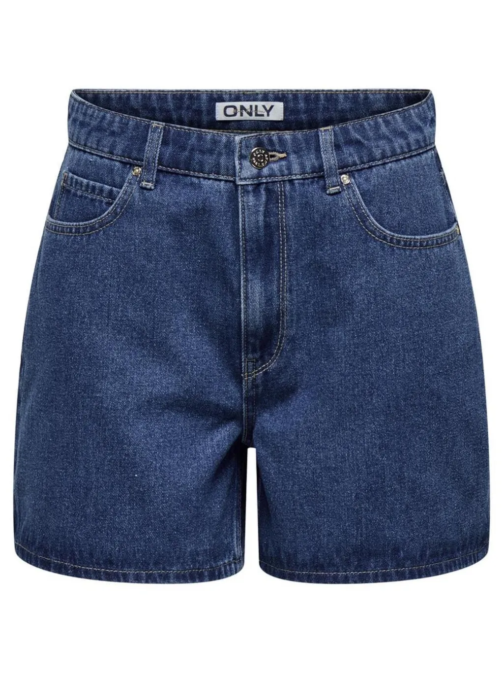 Denimshorts fra Only i mellemblå. De har høj talje og en loose fit med mom-silhuet. Shortsene kommer med bæltestropper samt knap- og lynlåslukning.