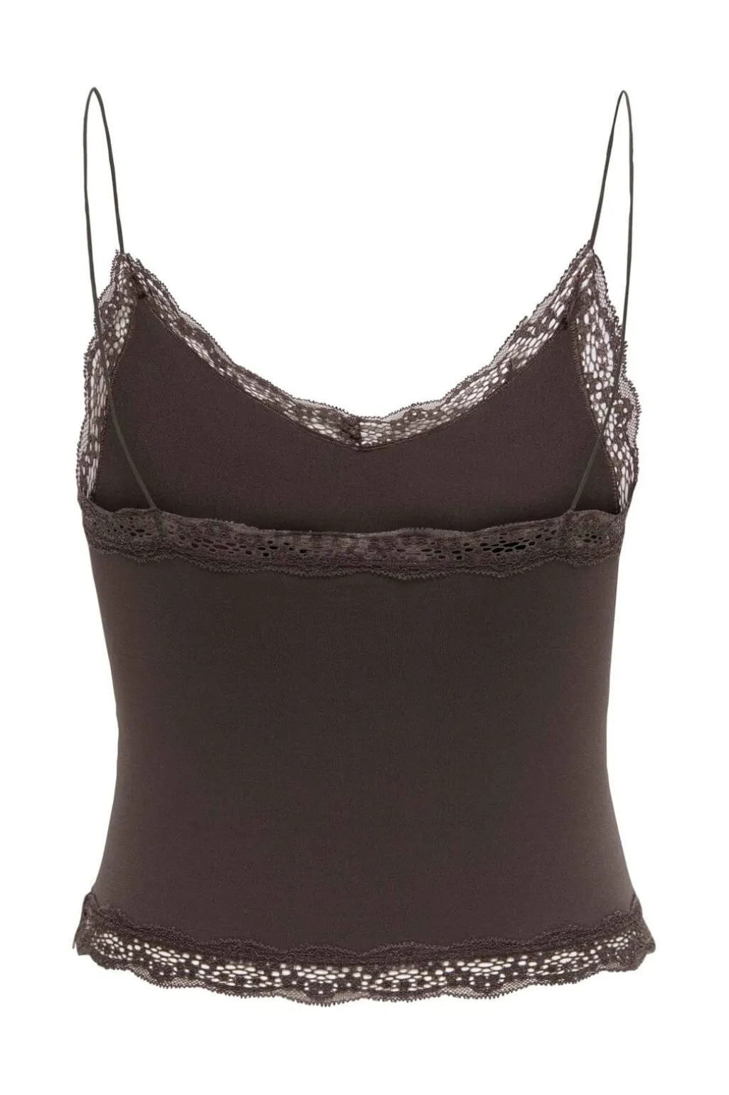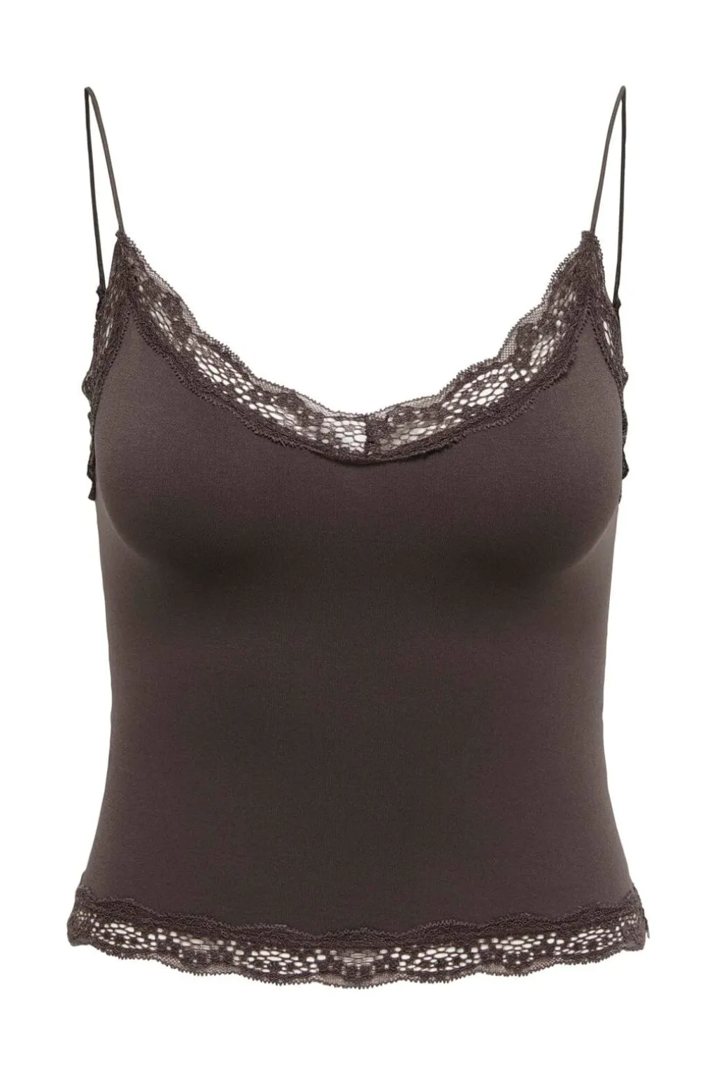 Brun cropped top fra Only med blondekanter. Toppen har en V-udskæring og er lavet i et blødt, strækbart materiale med fine blondedetaljer langs kanterne.