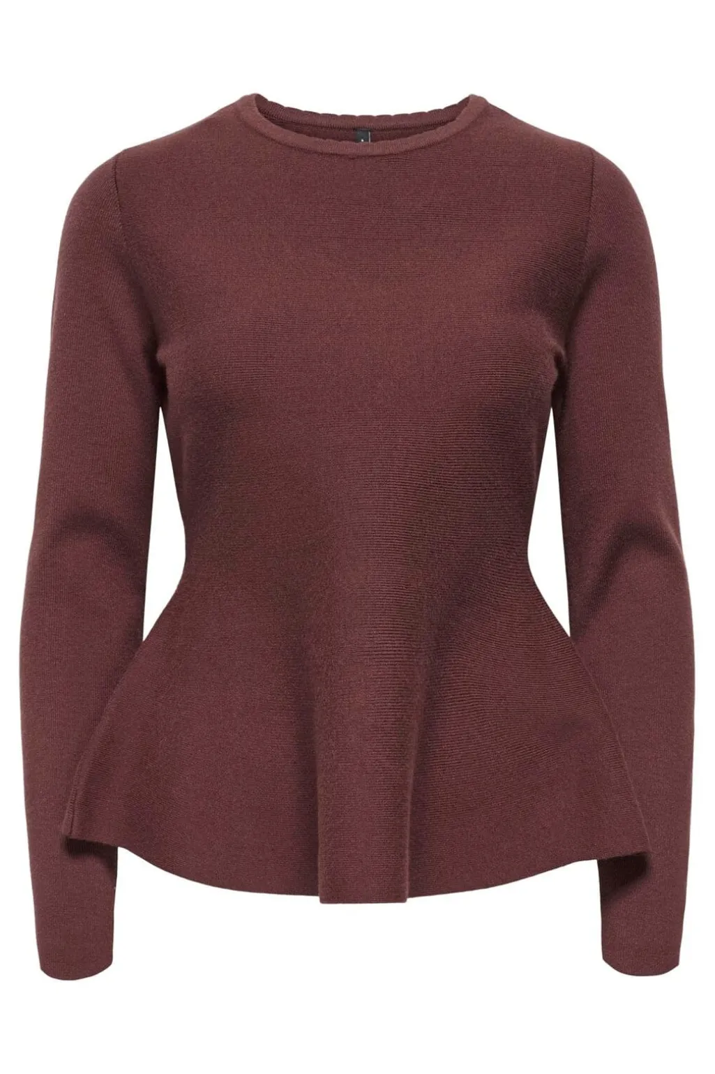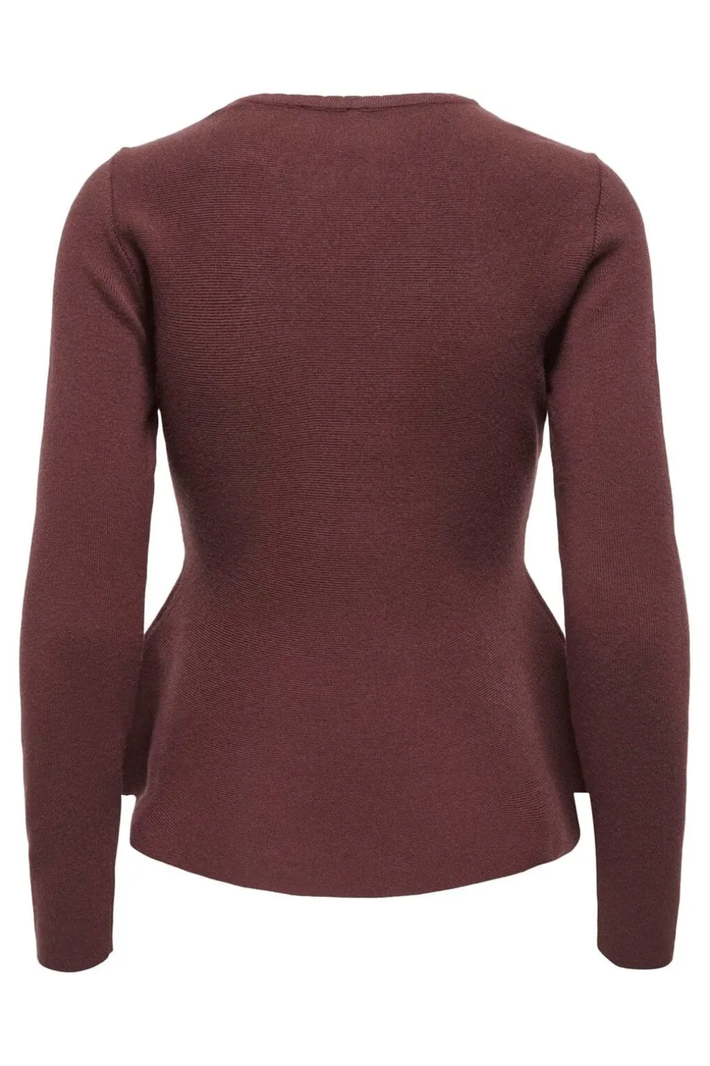 Brunrød striktrøje fra ONLY med peplumdetalje. Toppen har en rund halsudskæring og lange ærmer i en regular fit-pasform.