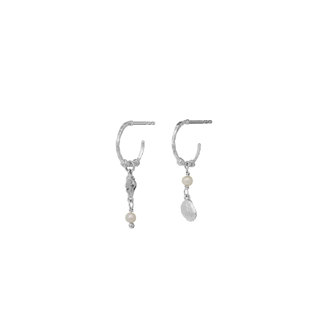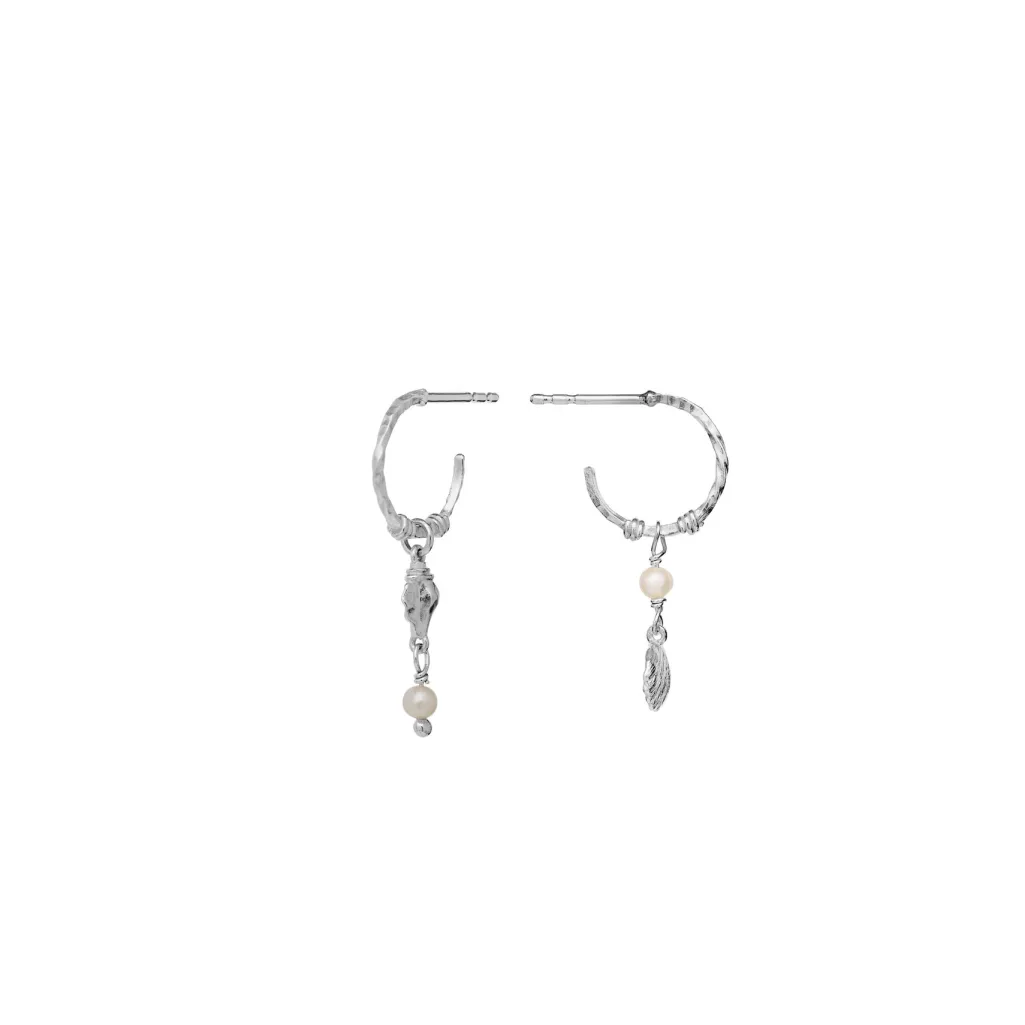Sølvfarvede hoop-øreringe fra Maanesten med ferskvandsperler. Øreringene har et snoet design med dekorative vedhæng, der giver dem et særpræg.