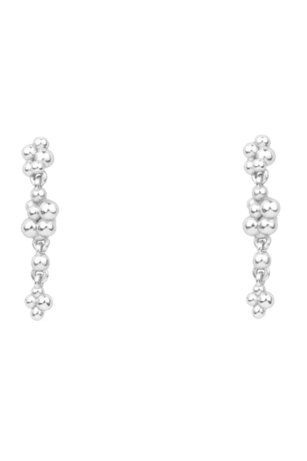 Sølvøreringe fra House of Vincent med perlelignende kugler i et lodret design. De skinnende kugler danner en kæde fra top til bund, hvilket giver øreringene et rent og stilrent udtryk.