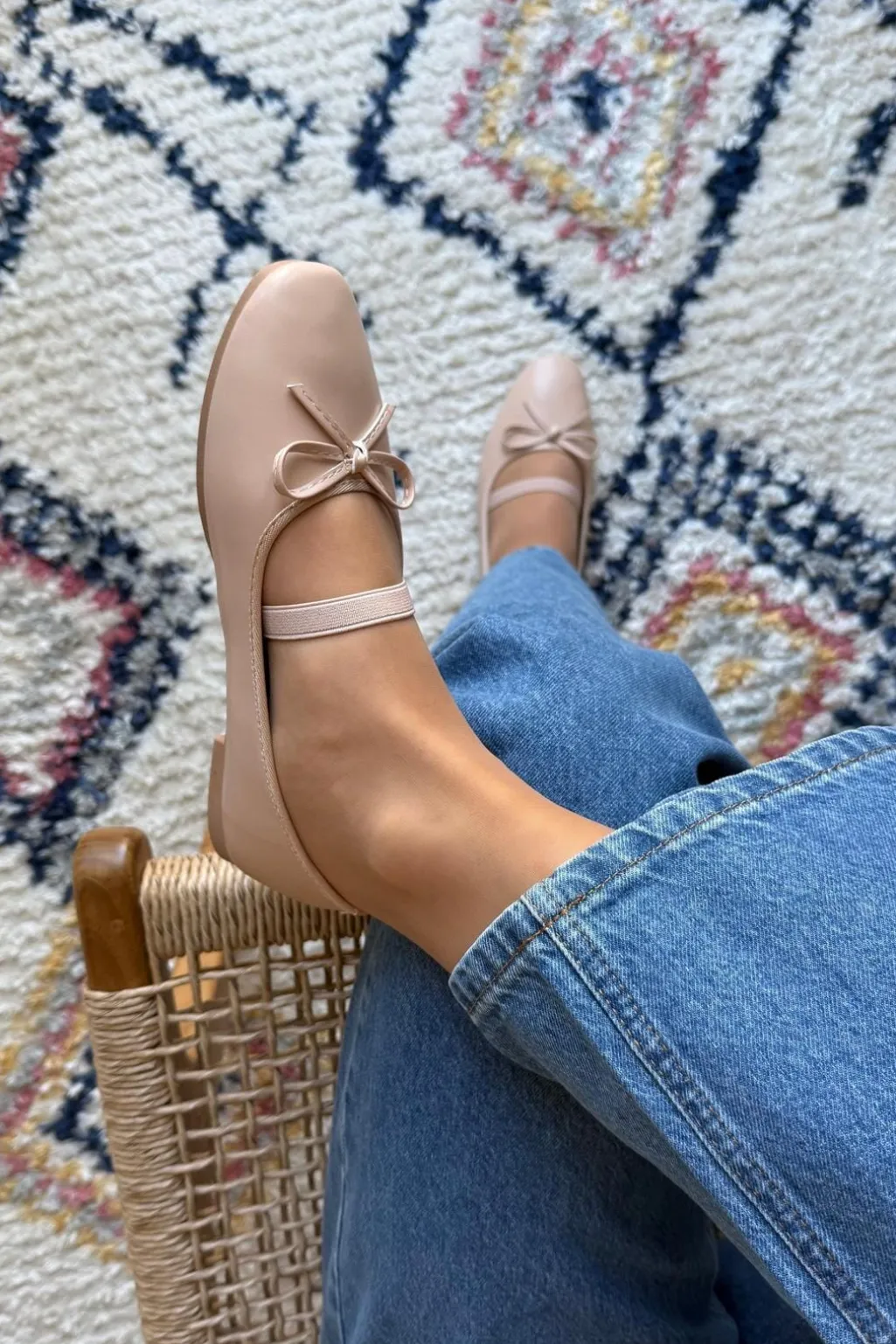 Beige ballerinasko fra Bloom med rund tå og sløjfedetalje. Skoen har en lav hæl og snørelukning, som gør den praktisk til både hverdag og fest.