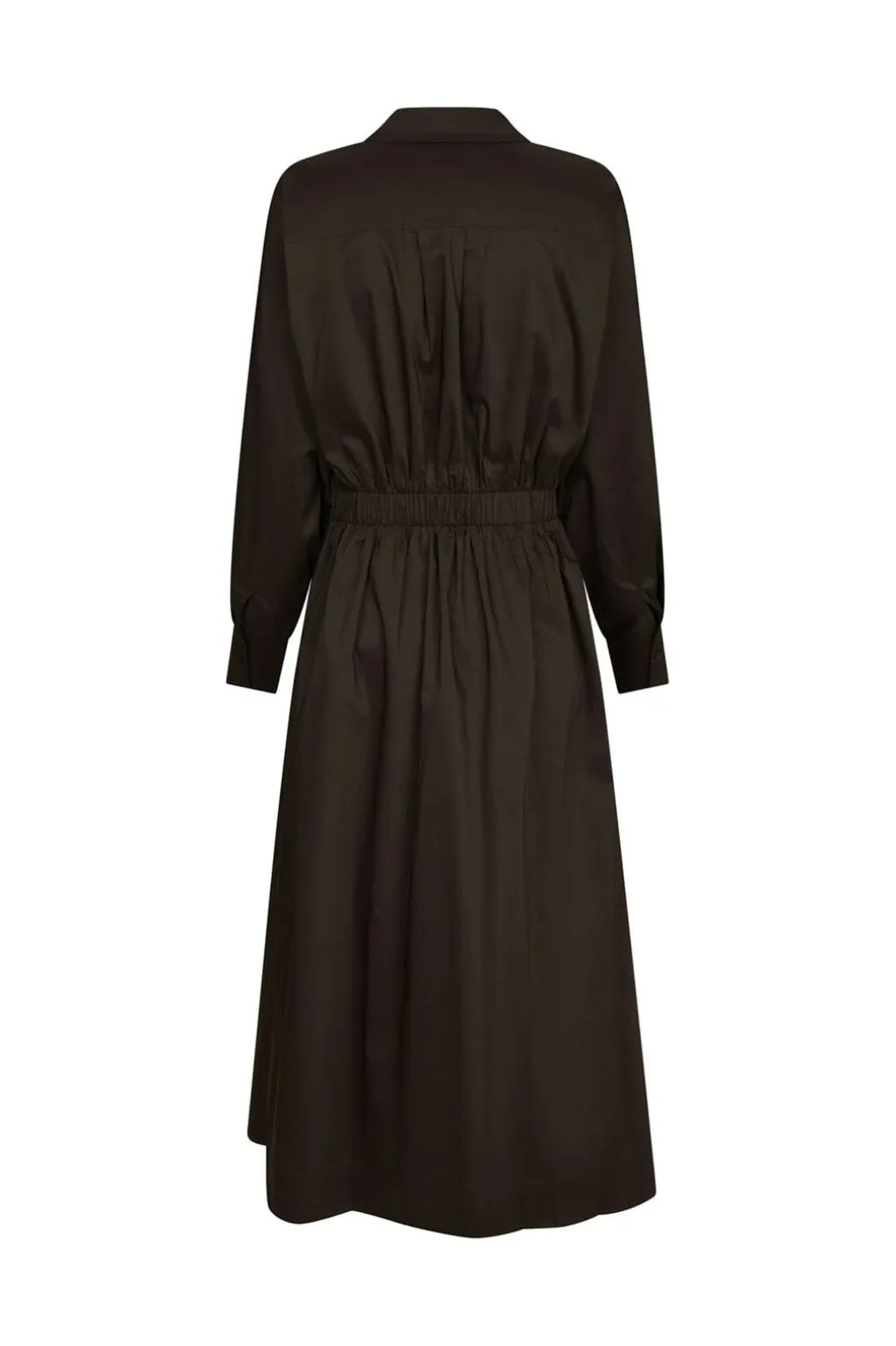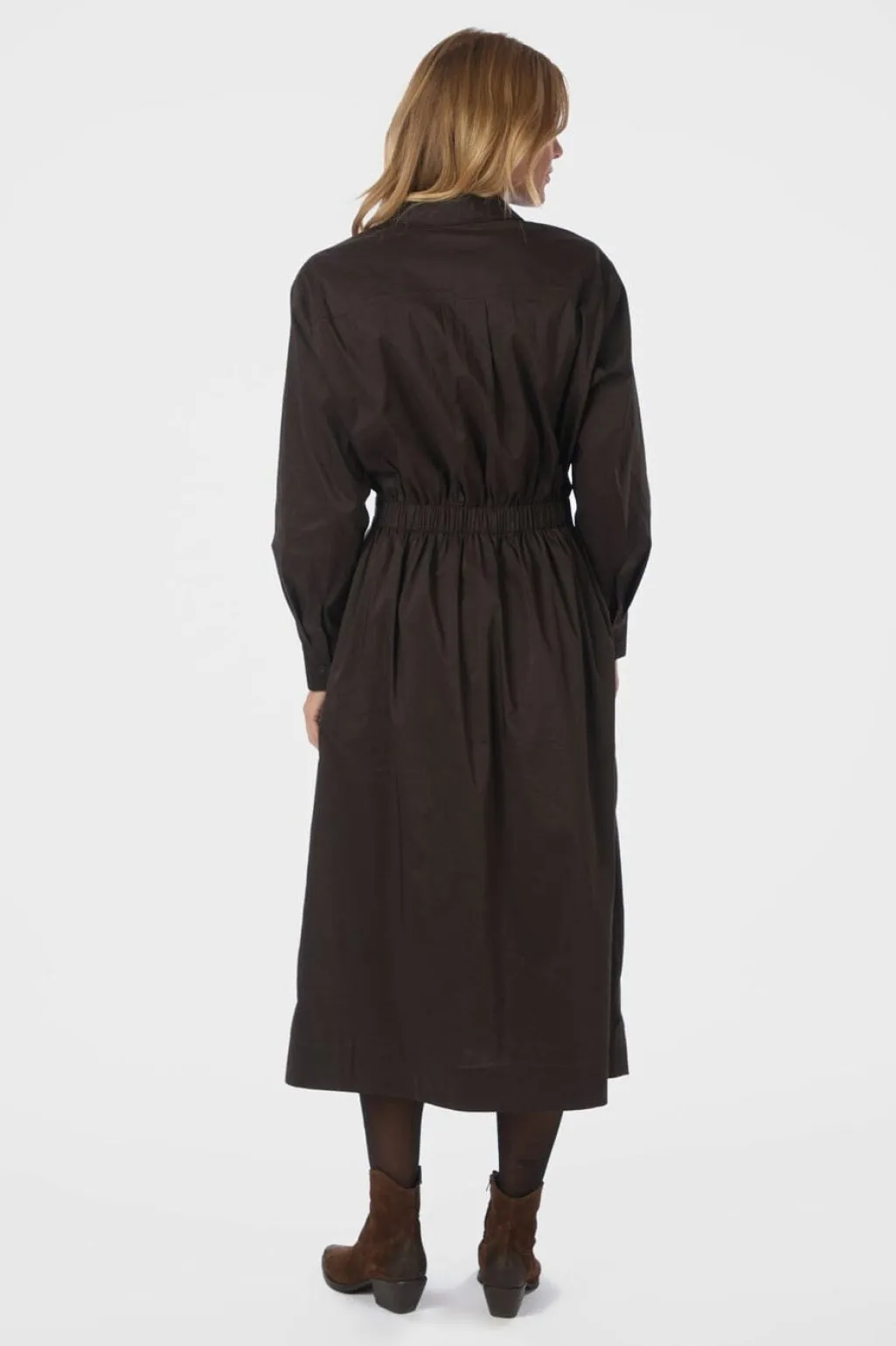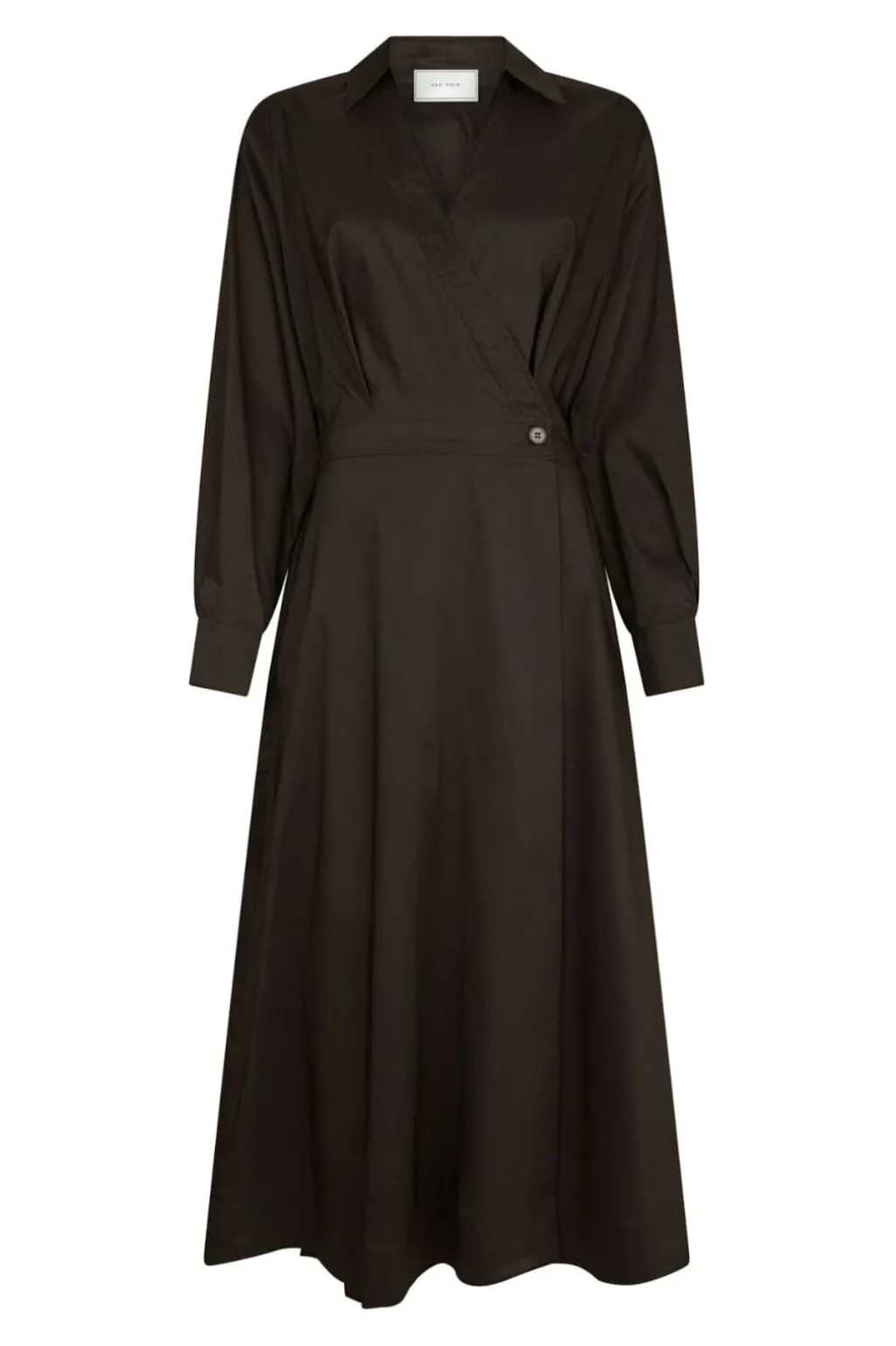 Brun kjole fra Neo Noir, lavet af en blanding af bomuld, nylon og elastan. Kjolen har en slå-om-effekt foran med knappelukning og lange ærmer.