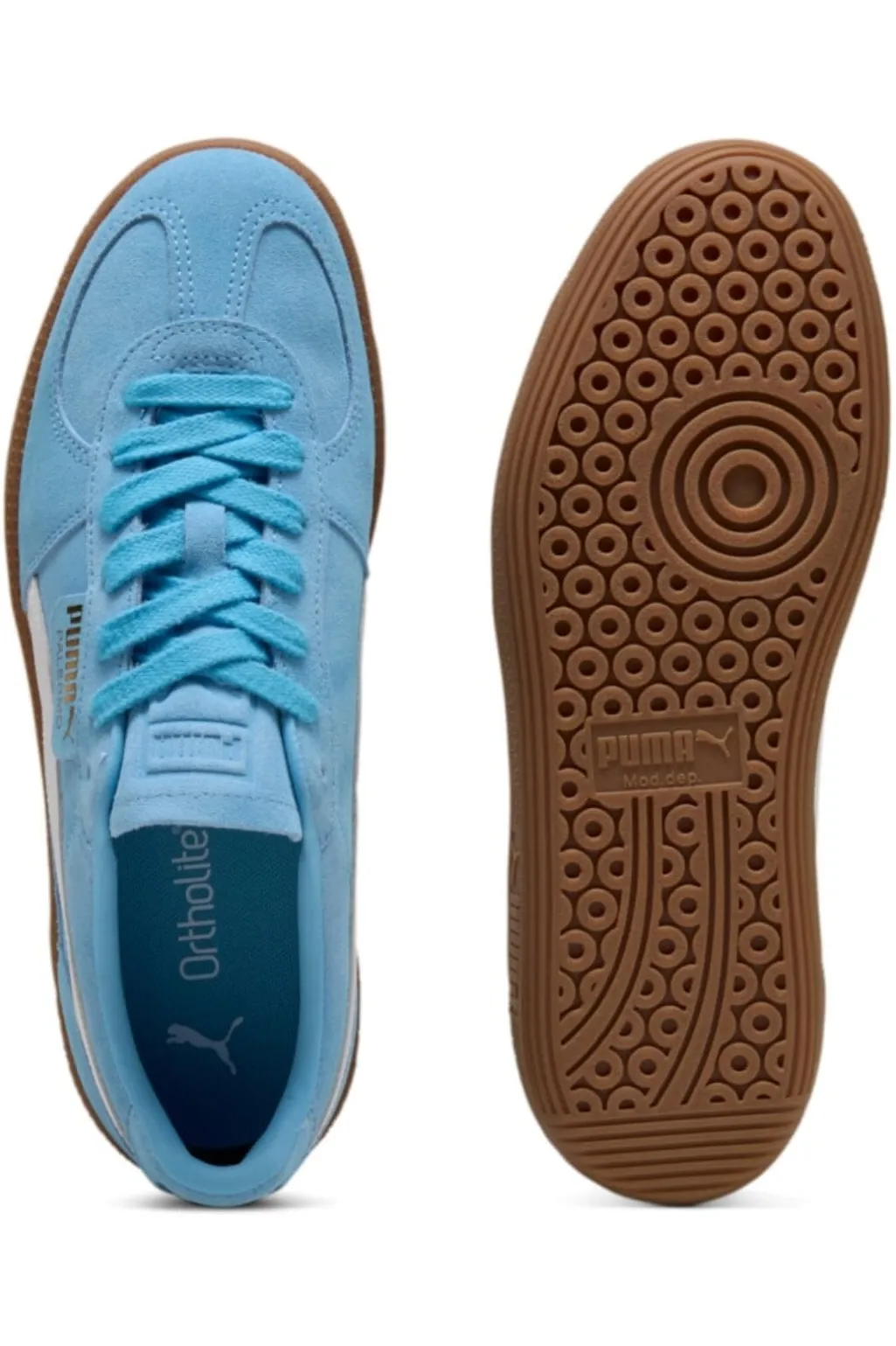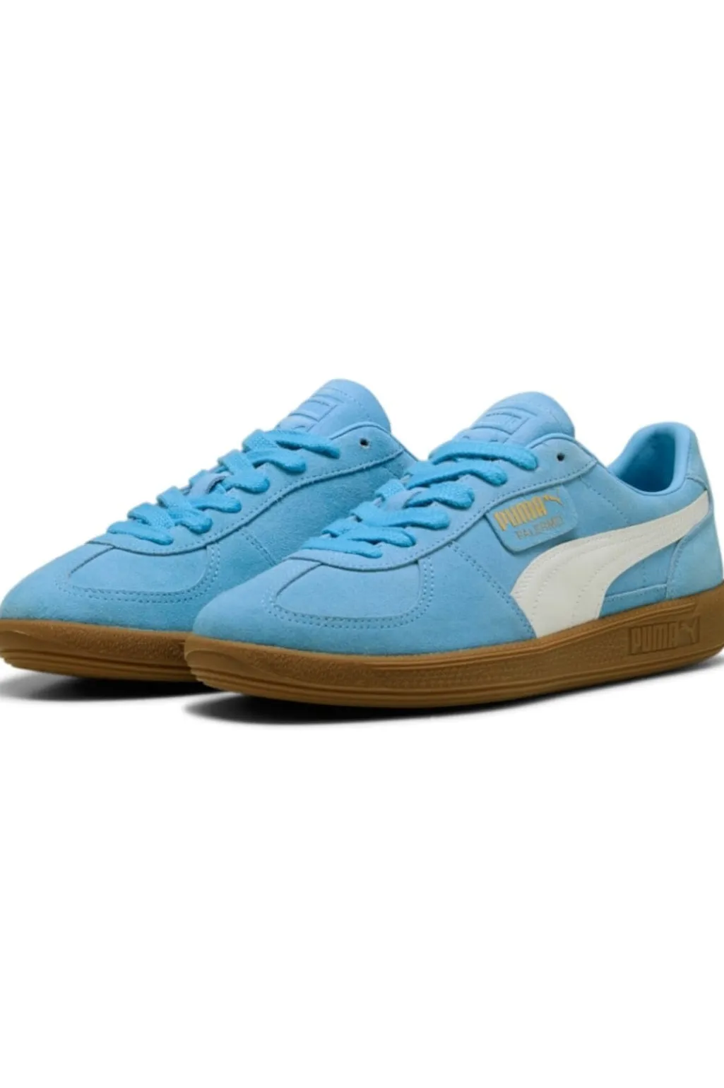 Blå sneakers fra Puma med hvide detaljer og gummisål. Overdelen har en blød læderstruktur med den klassiske Puma-stribe på siden.