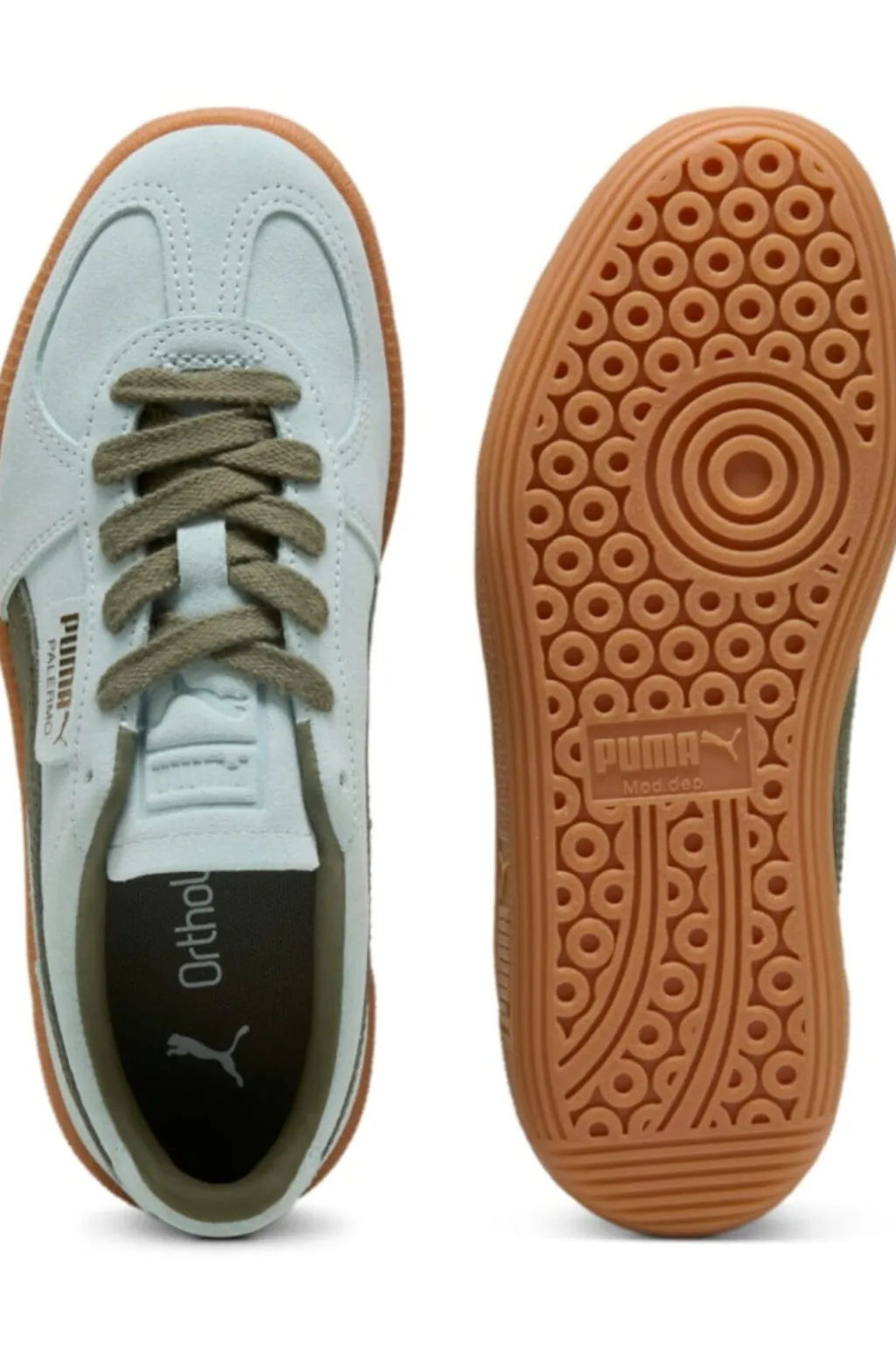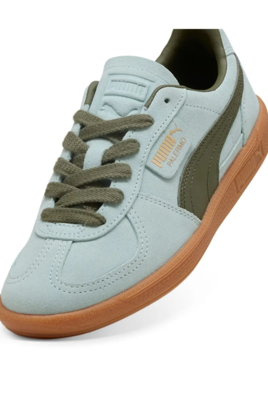 Lyseblå sneakers fra Puma med olivengrønne detaljer. Overdelen er fremstillet i læder med en robust gummisål. Skoen har et retro-inspireret design med snørebånd.