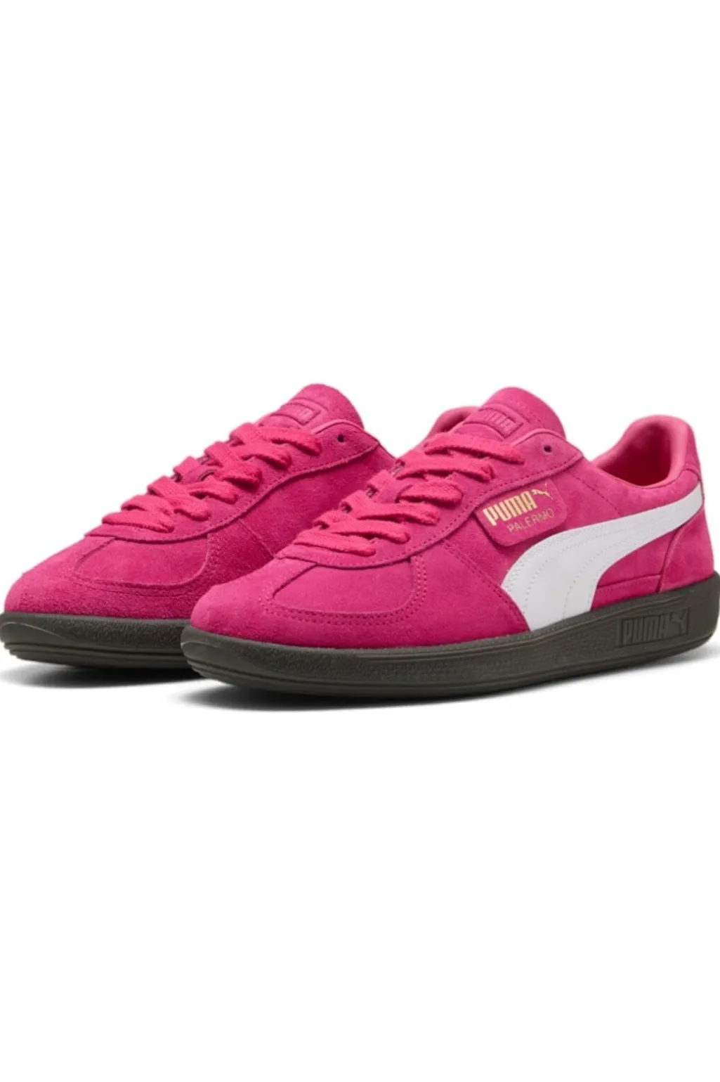 Pink sneakers fra Puma med hvide detaljer. Skoene har en overdel i læder og en sort gummisål, der giver god støtte til foden.