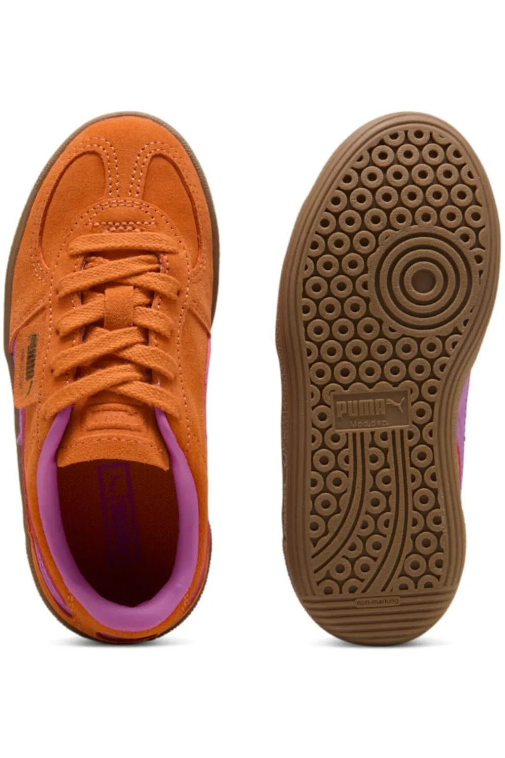 Orange sneakers fra Puma med ruskindsoverdel og lilla detaljer. Palermo-modellen kombinerer street style med sporty elementer gennem sin klassiske udformning.