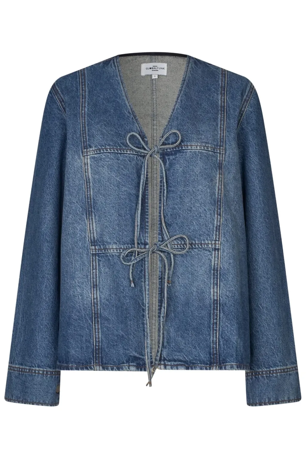 Denimjakke fra Global Funk i lys til mellemblå vask. Jakken har en løs pasform med V-udskæring og lange ærmer. Bindebåndsdetaljerne foran giver mulighed for at tilpasse pasformen.