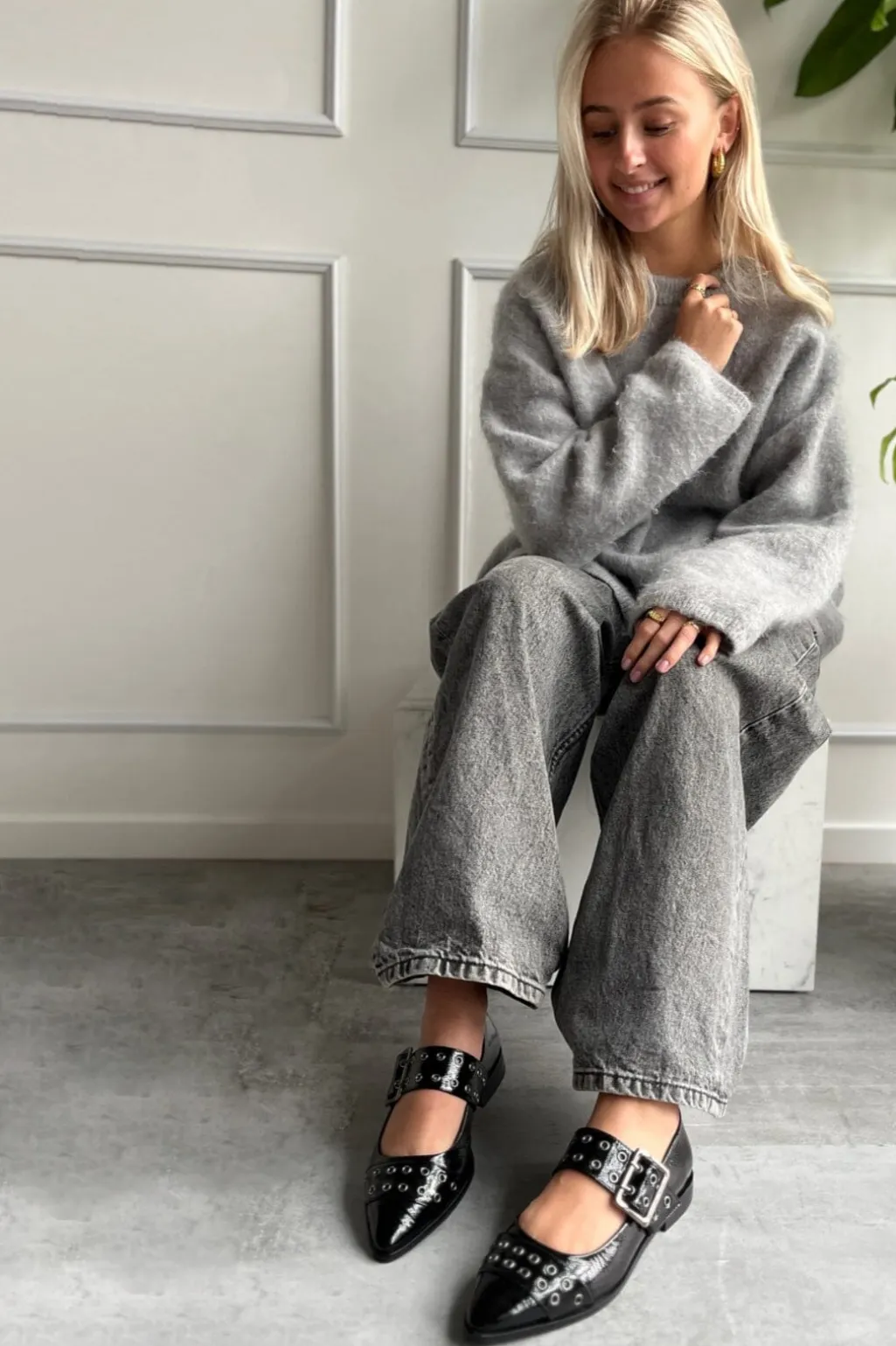 Sorte ballerinaer fra Copenhagen Shoes i blankt patentmateriale med spids tå og spænderem. Nitterne på remmen giver skoen et markant udtryk.