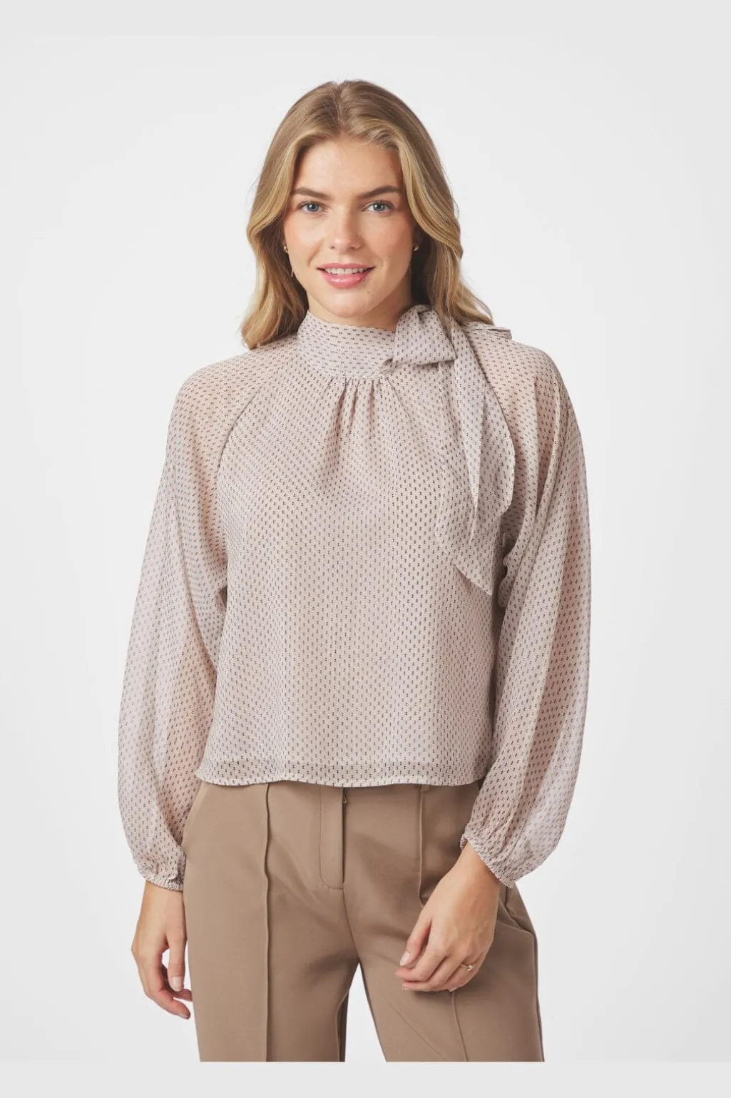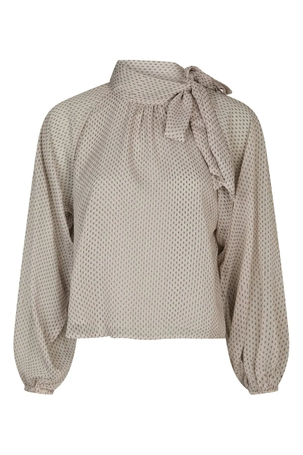 Bluse fra Neo Noir i creme med prikket print. Blusen har en løstsiddende pasform og en høj hals med knudedetalje.