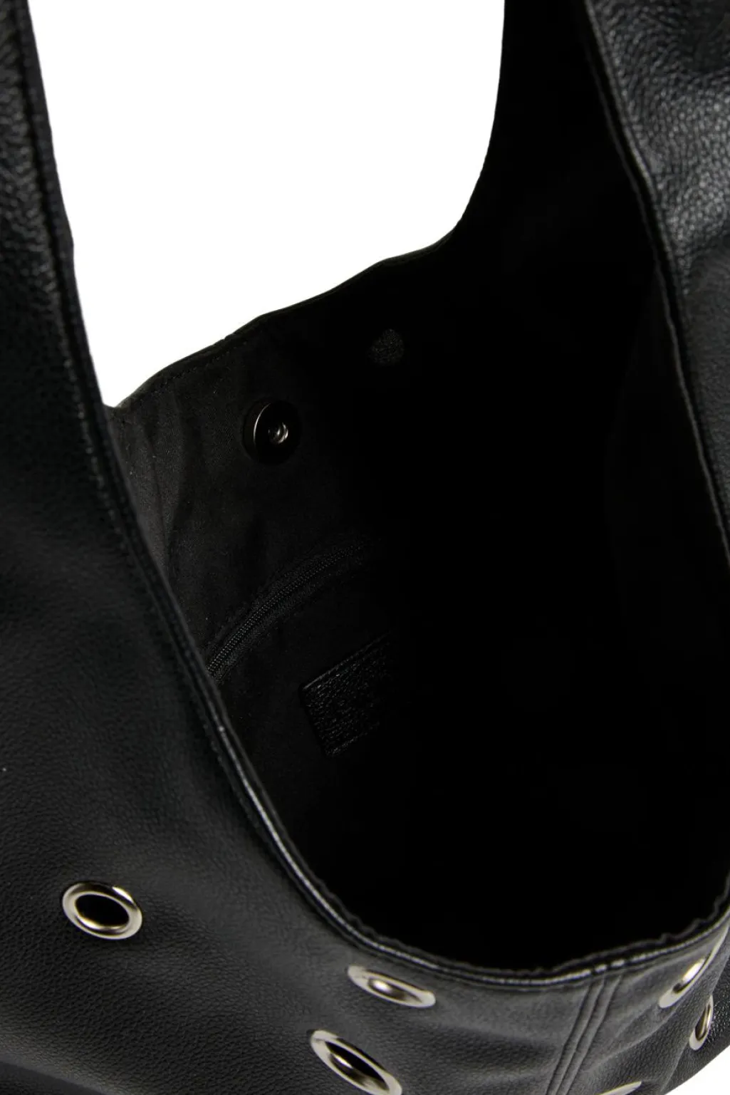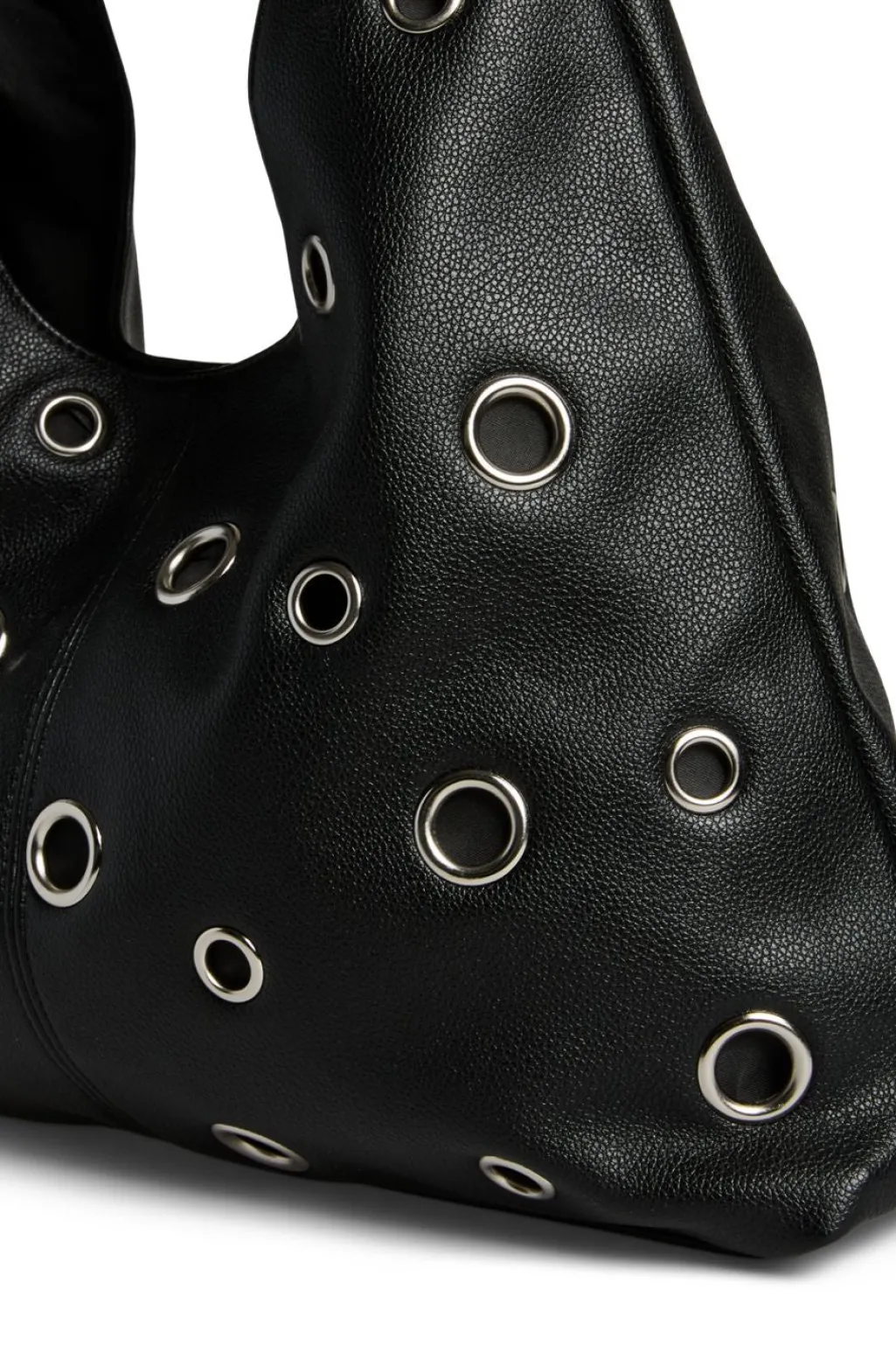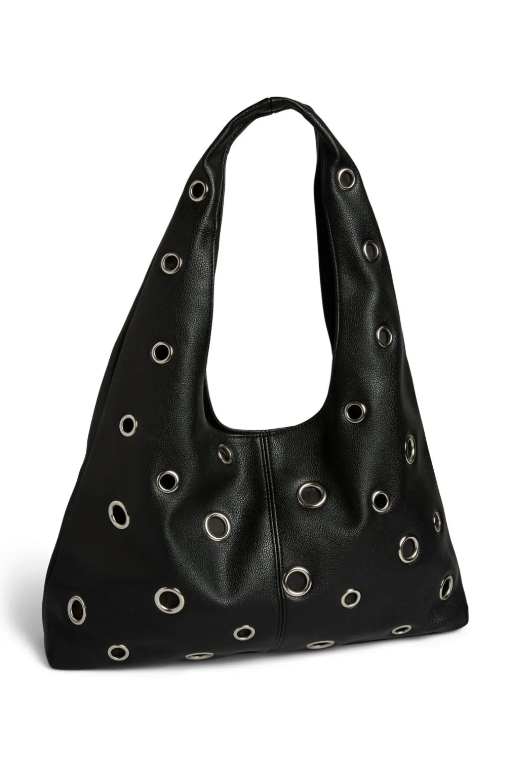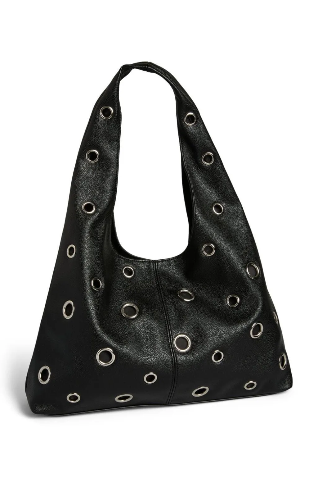 Sort skuldertaske fra Pieces med metaløjer på overfladen. Tasken har en bred, buet skulderrem og kombinerer praktisk opbevaring med et råt design.
