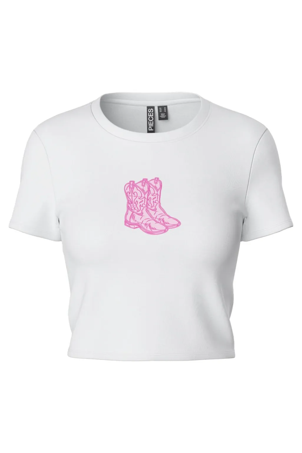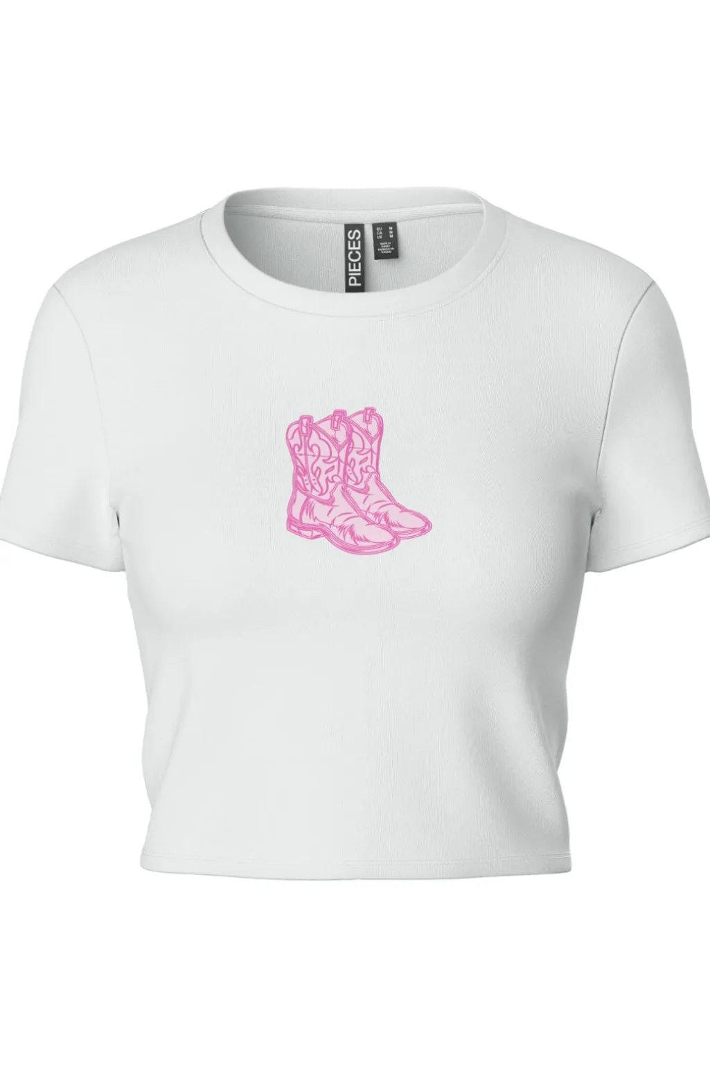 Hvid t-shirt fra Pieces med pink cowboystøvle-print. T-shirten har en rund hals, korte ærmer og en regular fit, der giver god bevægelsesfrihed.