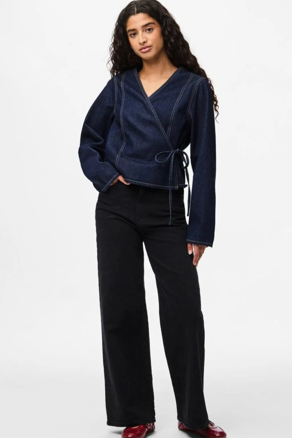 Denimskjorte fra Pieces i mørkeblå denim med v-hals og bindebånd i taljen. Skjorten har kontrasterende syninger og en wrap-lukning med bindebåndsdetaljer.