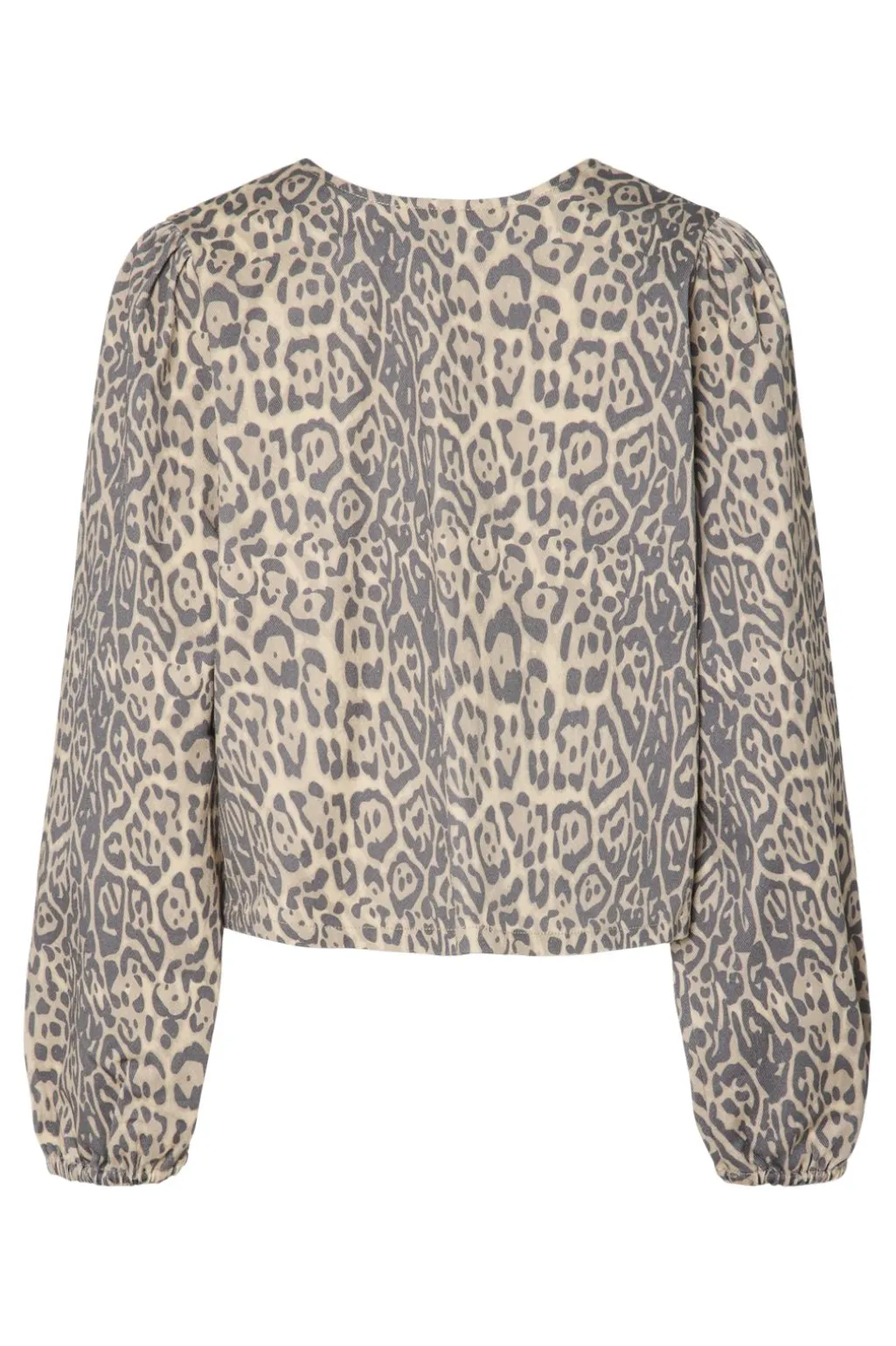 Sort bluse fra Pieces med beige leopardmønster. Den har et reversibelt design med sorte bindebånd foran og lange ærmer med puf-effekt. Blusen har en løs pasform.