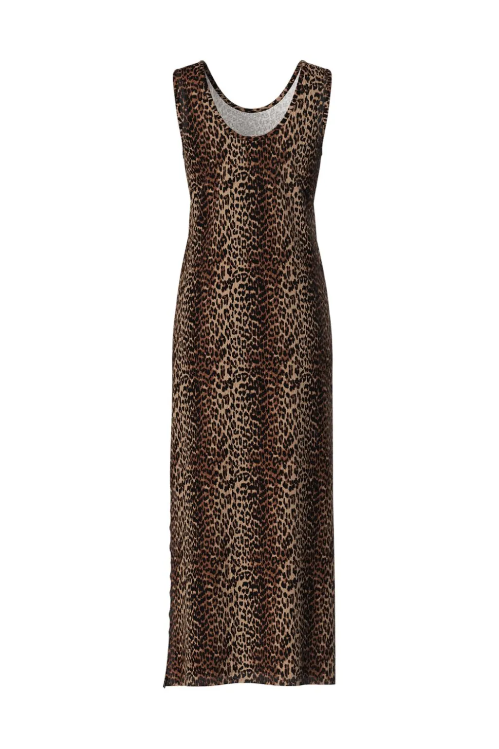 Ærmeløs maxikjole fra Pieces med leopardmønster. Kjolen har en firkantet halsudskæring og en løs pasform, der går ned til anklerne.