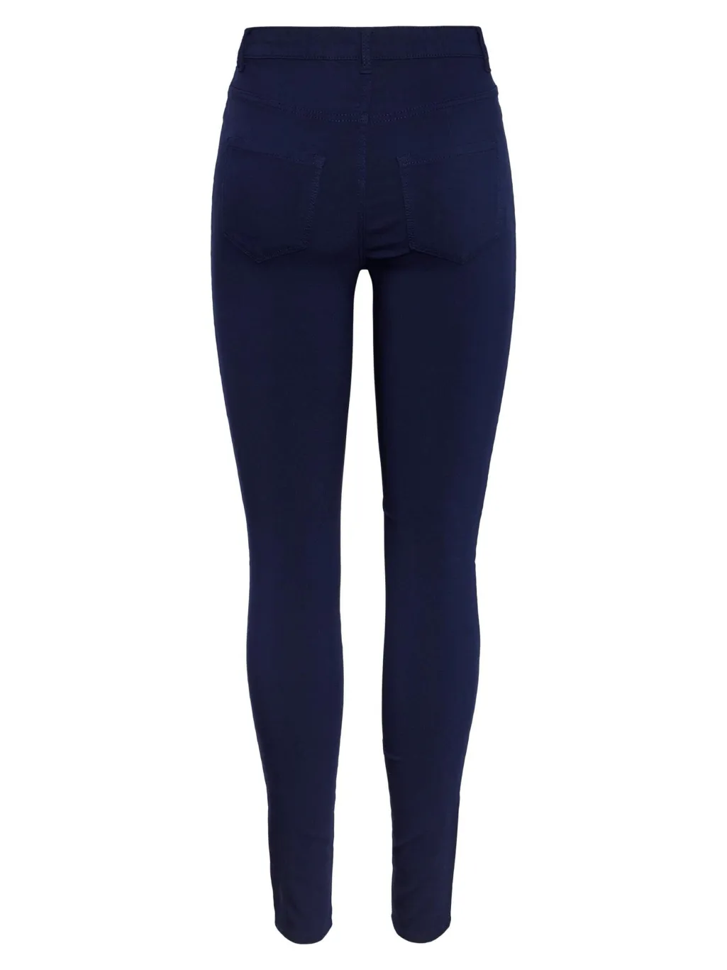 Marineblå jeggings fra Pieces med høj talje og skinny fit. Bukserne har en ankellængde og er udstyret med lynlås i gylpen samt bæltestropper.