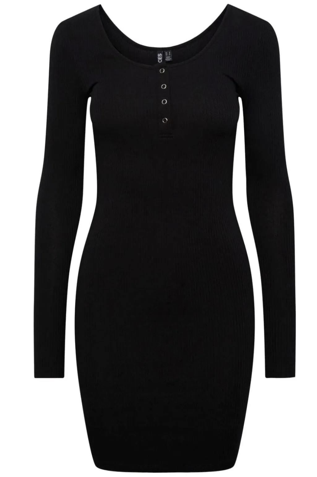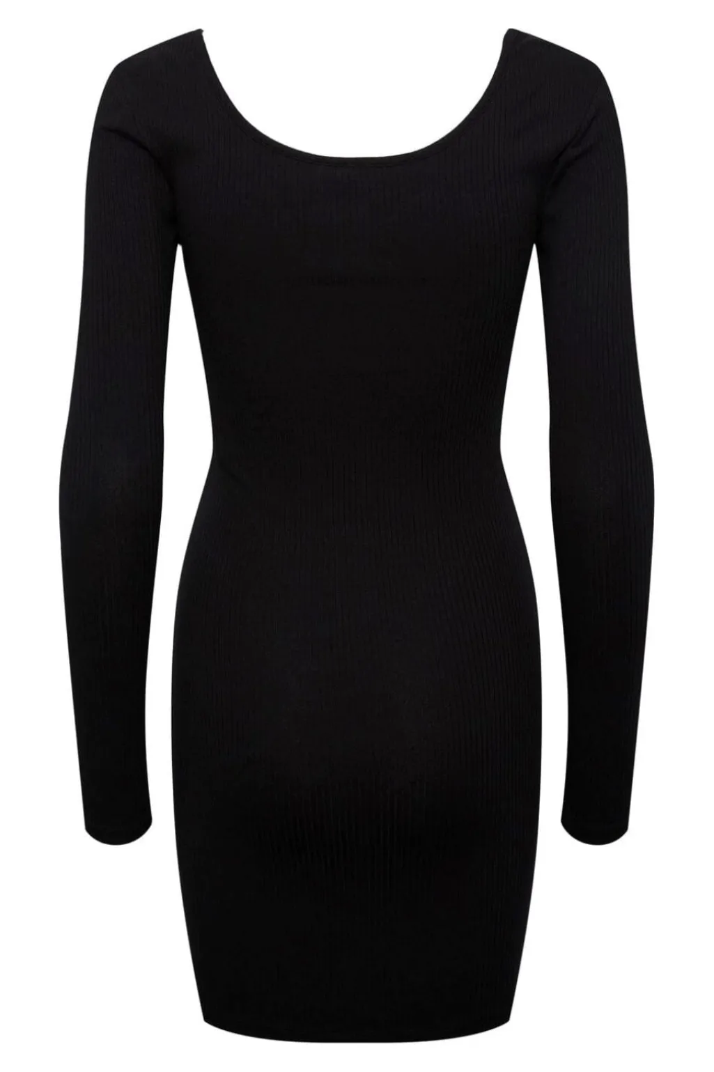 Sort kjole fra Pieces med ribbet tekstur og lårlængde. Kjolen har en kropsnær silhuet med lange ærmer og rund halsudskæring med knapdetaljer ved brystet.