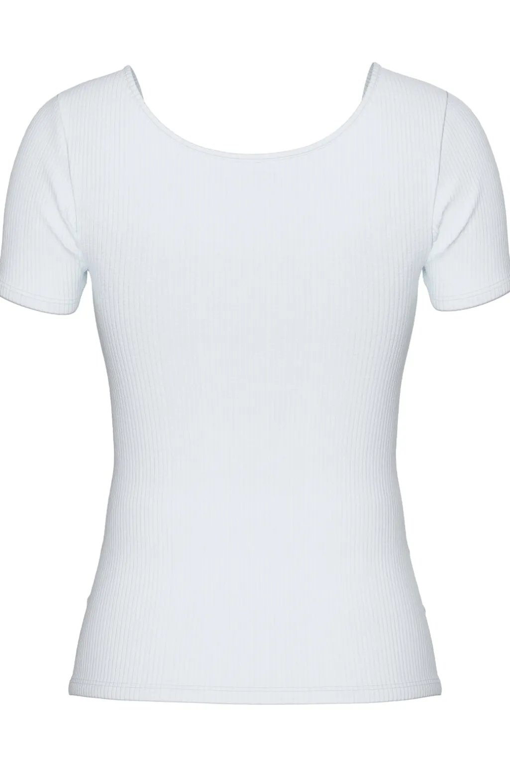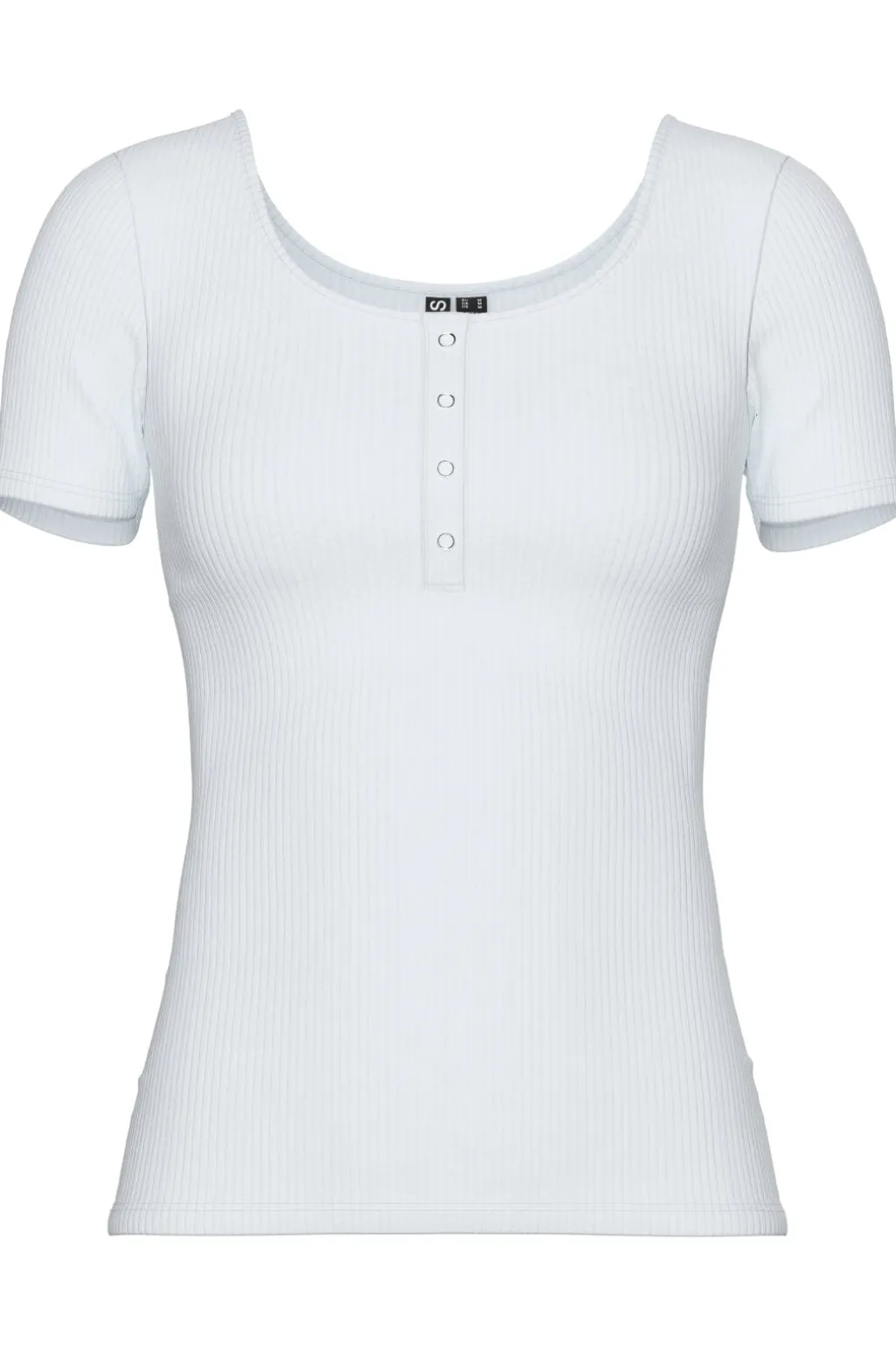 Hvid kortærmet top fra Pieces med ribbet struktur. Toppen har en rund halsudskæring og fire knapper foran. Den kropsnære pasform og det bløde materiale gør den nem at style.