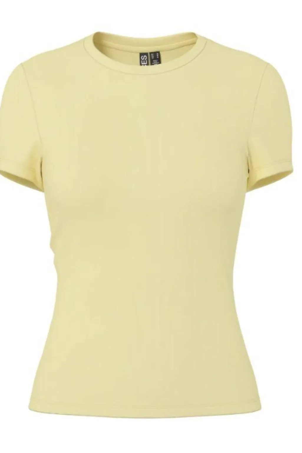 T-shirt fra Pieces i en lys cremefarvet nuance. Den har korte ærmer, rund halsudskæring og en tætsiddende pasform.