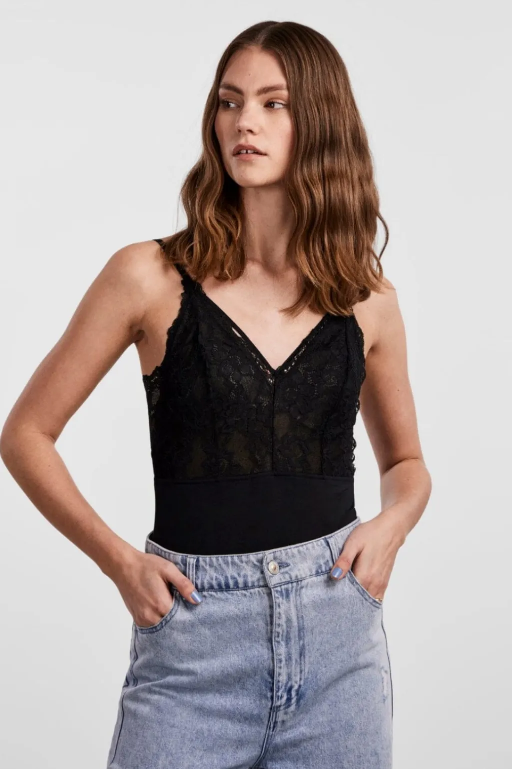 Sort bodystocking fra Pieces med blondedetaljer i overdelen. Designet med tynde spaghettistropper og V-halsudskæring. Den hoftekorte længde gør den let at style med forskellige bunde.