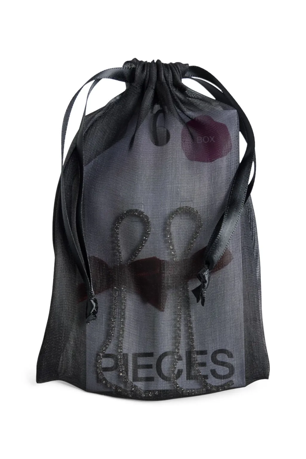 Sølvfarvede øreringe fra Pieces med røde fløjls-sløjfer og glimtende detaljer. Øreringene har sommerfuglelås og et langt, slankt design med sløjfe i toppen.