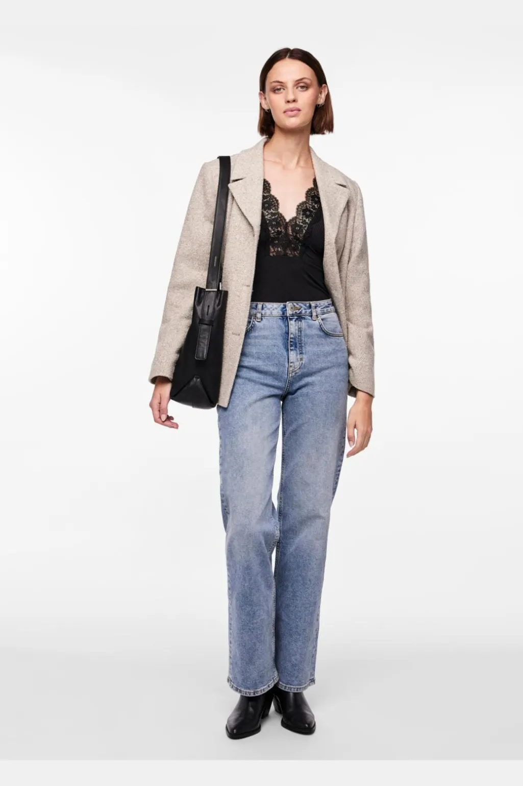 Sort bodystocking fra Pieces med ribbet tekstur og blondedetaljer. Den dybe V-udskæring har en markant blondekant, og designet har et thong-snit i bunden.