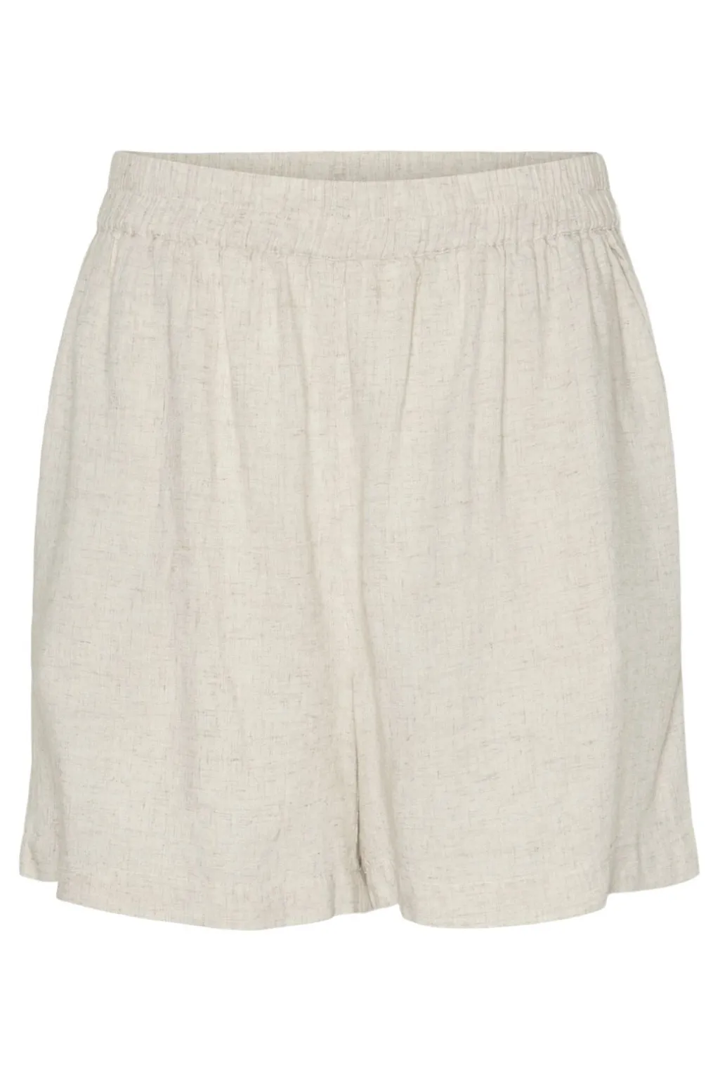 Shorts fra Pieces i en lys beige melange. De har en løs pasform og er lavet af vævet materiale med flæsedetaljer og elastisk taljebånd i livet.