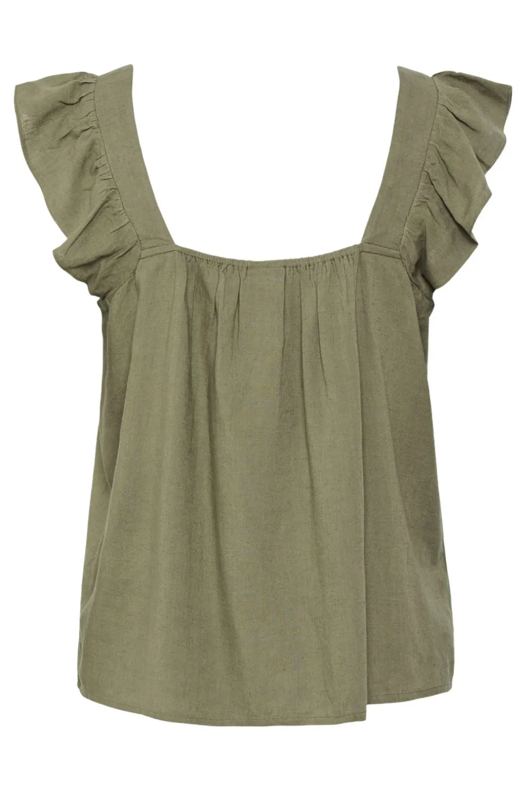 Top fra Pieces i en dyb grøn farve. Toppen har flæsedetaljer og en firkantet halsudskæring, der giver den et feminint præg. Den er lavet af en blød blanding af viskose og hør.