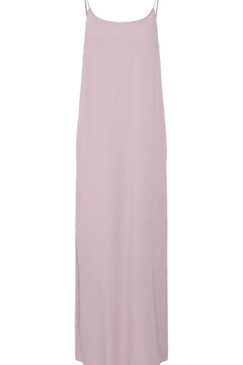 Ankellang kjole fra Pieces i en lys pink nuance. Kjolen har tynde, justerbare stropper og en løs pasform, der giver god bevægelsesfrihed.