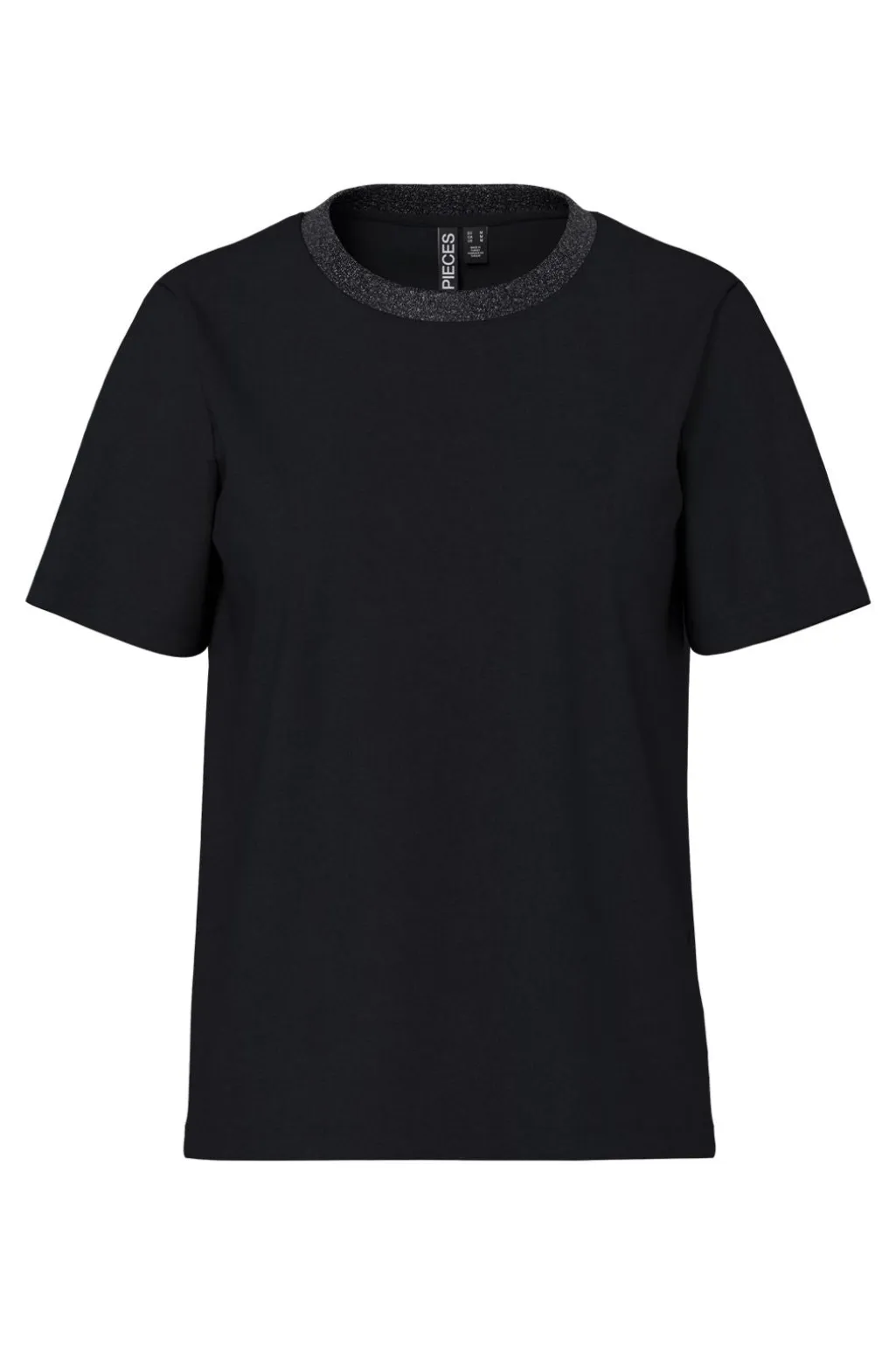 Sort t-shirt fra Pieces med rund halsudskæring og skinnende lurex-kant. T-shirten er fremstillet i økologisk bomuld og har korte ærmer.