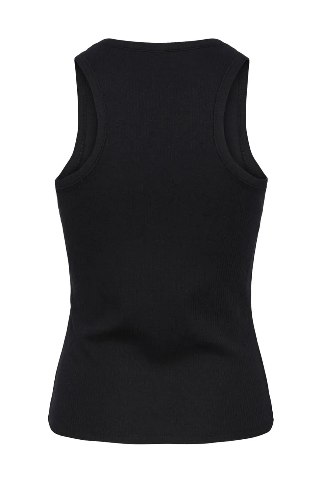 Sort tanktop fra Pieces med brede stropper og ribbet tekstur. Den har en rund halsudskæring og en regular pasform, der giver god bevægelsesfrihed.