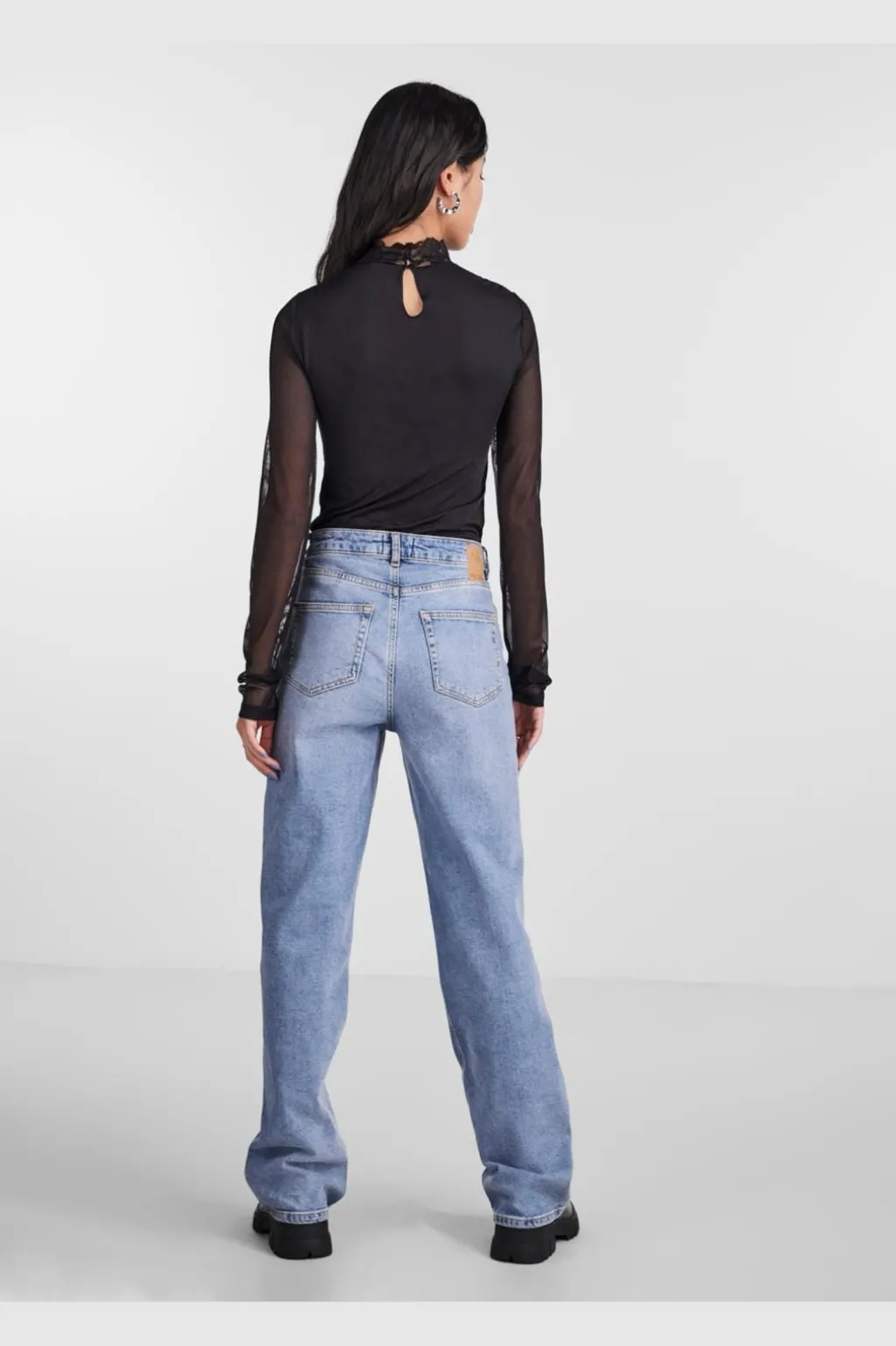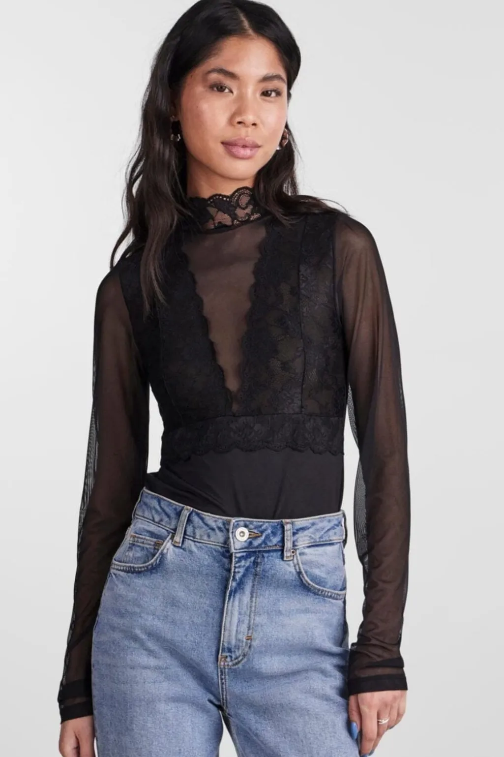 Sort bodystocking fra Pieces med høj hals og blondedetaljer. Den tætsiddende model har gennemsigtige ærmer og en dyb udskæring foran.