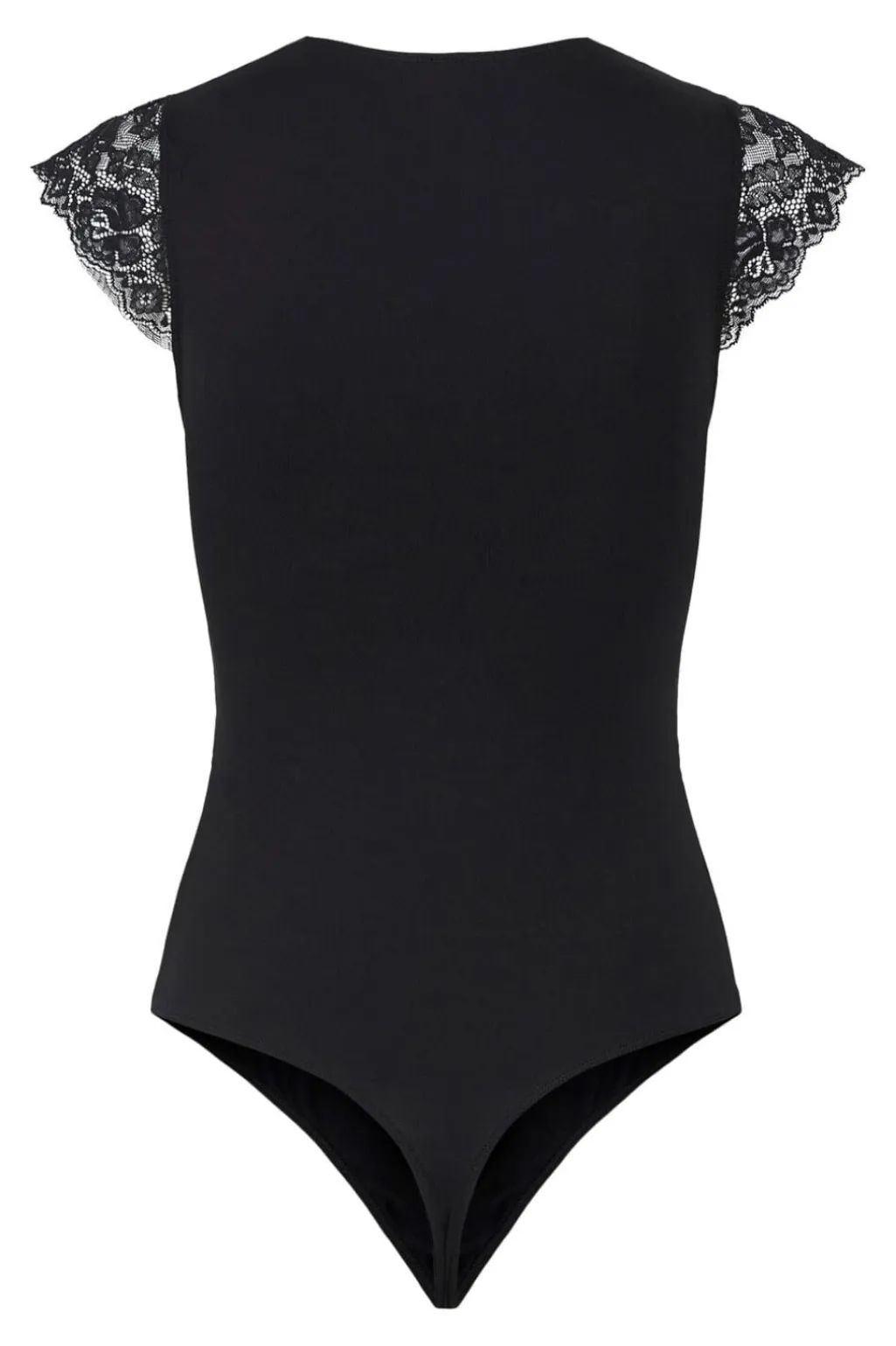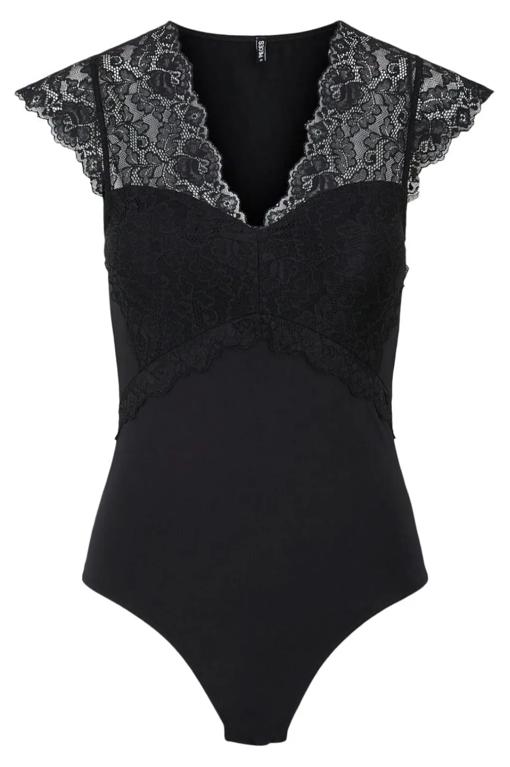 Sort bodystocking fra Pieces med blondedetaljer på skuldrene og ærmerne. V-halsudskæring og tætsiddende pasform giver en flot silhuet.