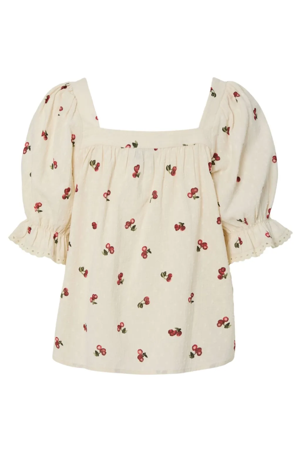 Top fra Pieces i cremefarvet bomuld med kirsebærmønster. Den firkantede halsudskæring og de 3/4-lange ærmer giver toppen et sommerligt udtryk med blondedetaljer langs kanten.