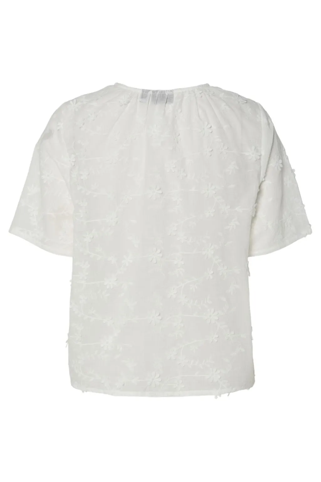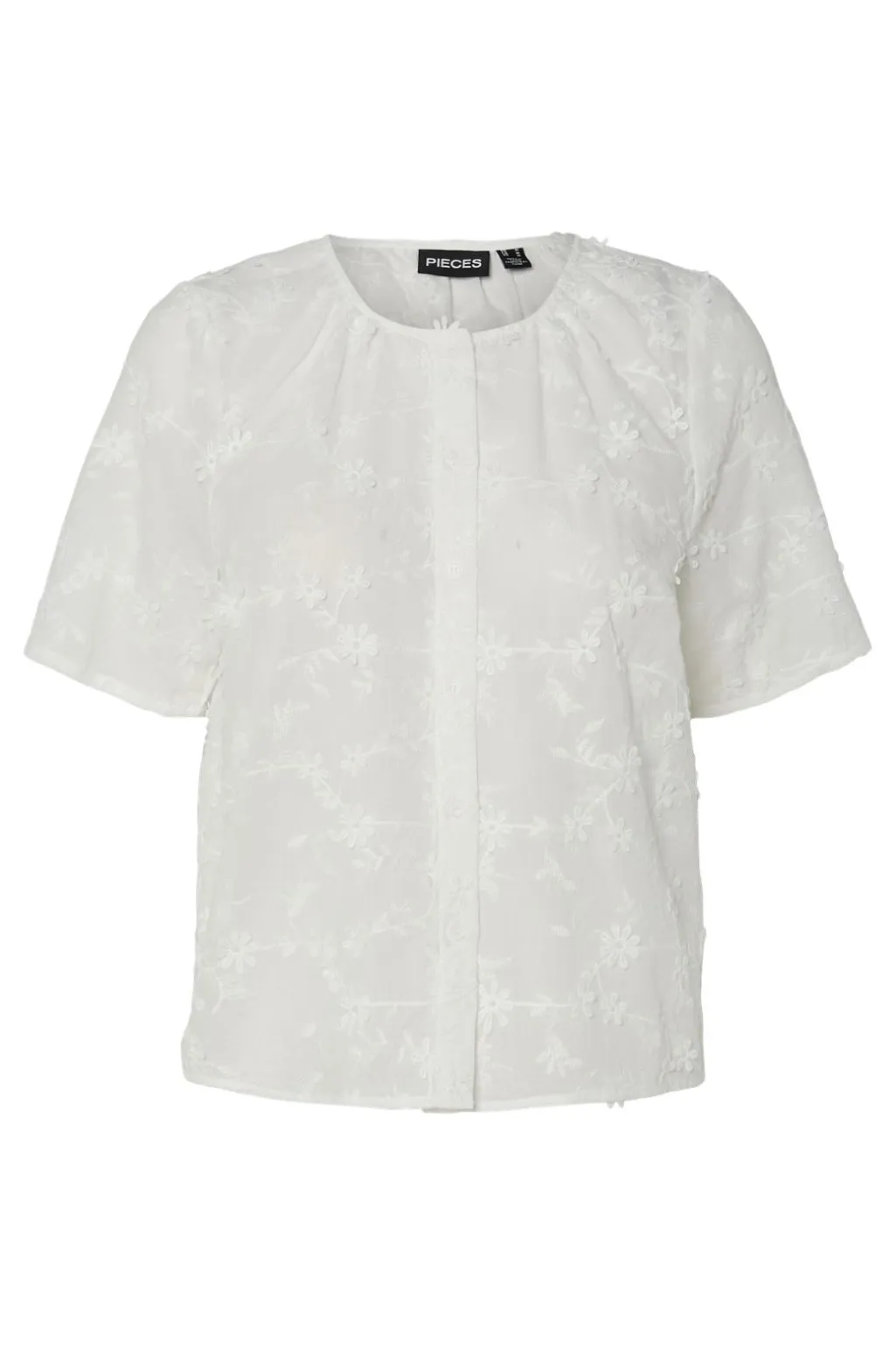 Hvid kortærmet top fra Pieces med blomsterbroderi. Toppen har en V-halsudskæring og knaplukning foran. De lette pufærmer og det fine broderi giver toppen et romantisk præg.