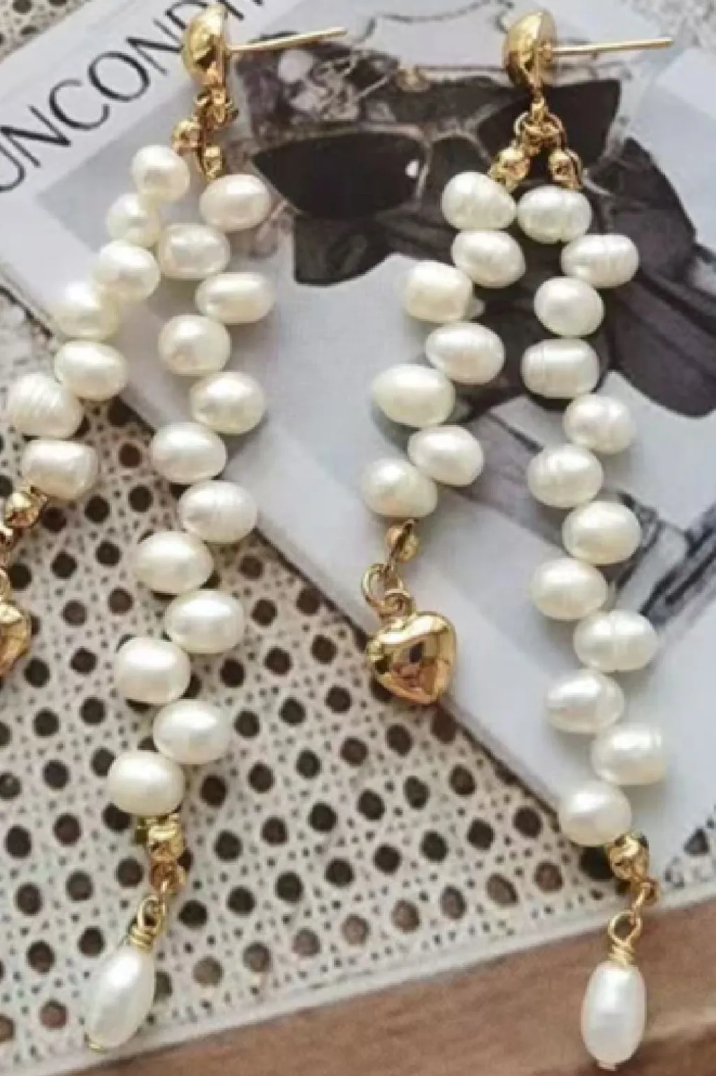 Lange øreringe fra Mellow Moon med ferskvandsperler i kaskadeform. De hvide perler er sat på en forgyldt kæde med et hjertevedhæng i bunden.