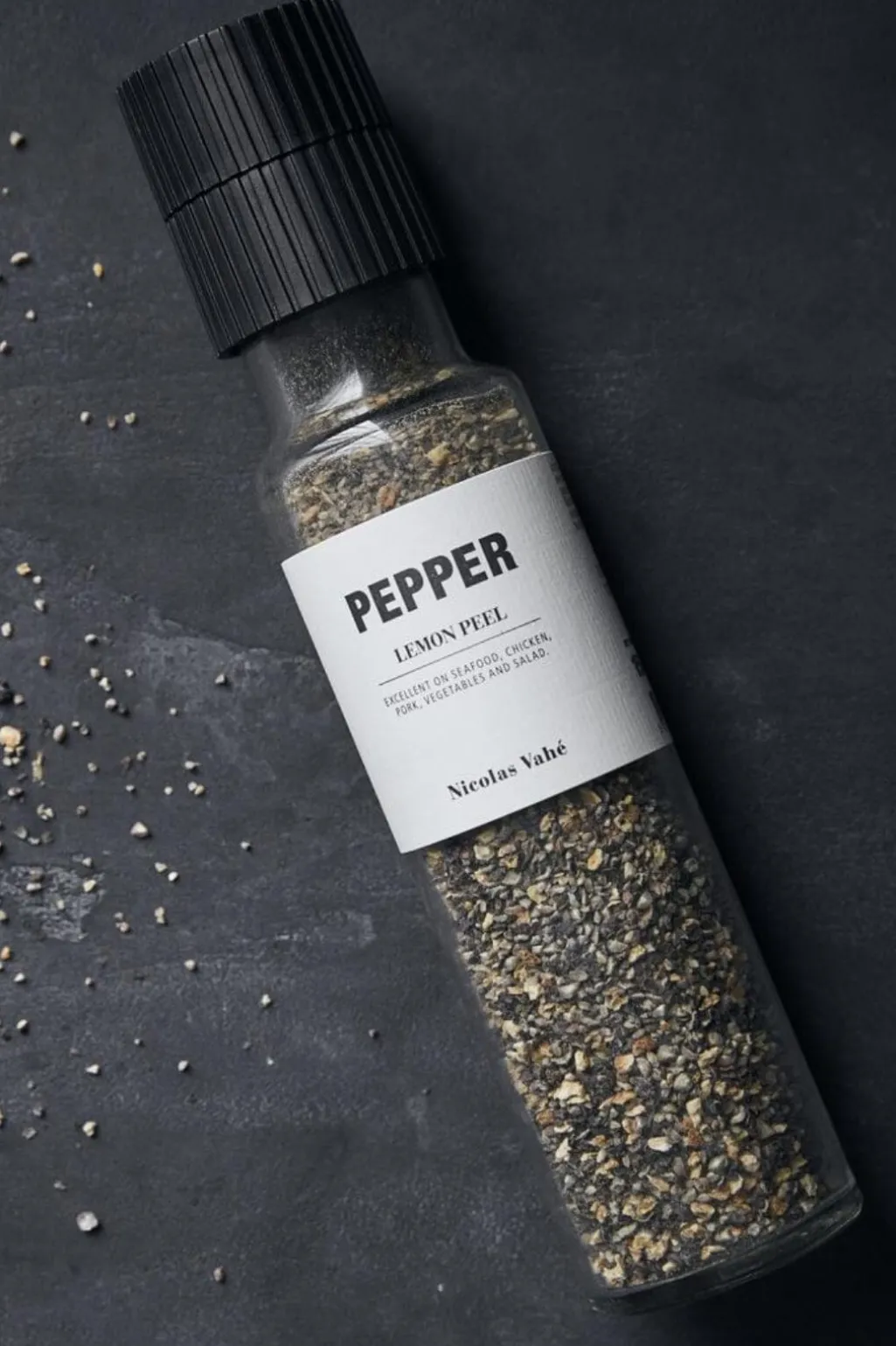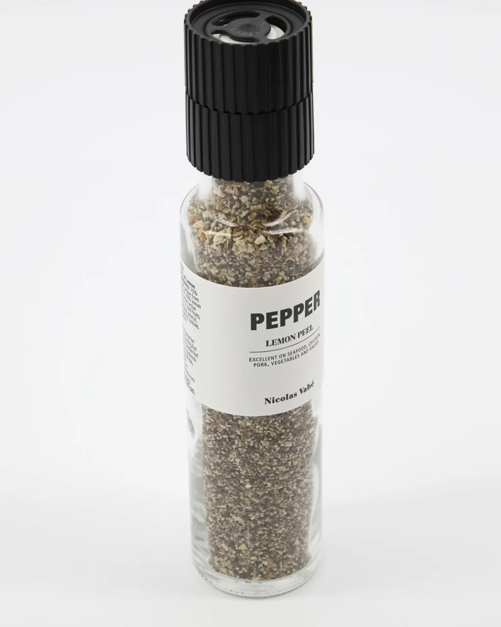 Materiale: sorte peberkorn knust 70%, citronskal 30%.