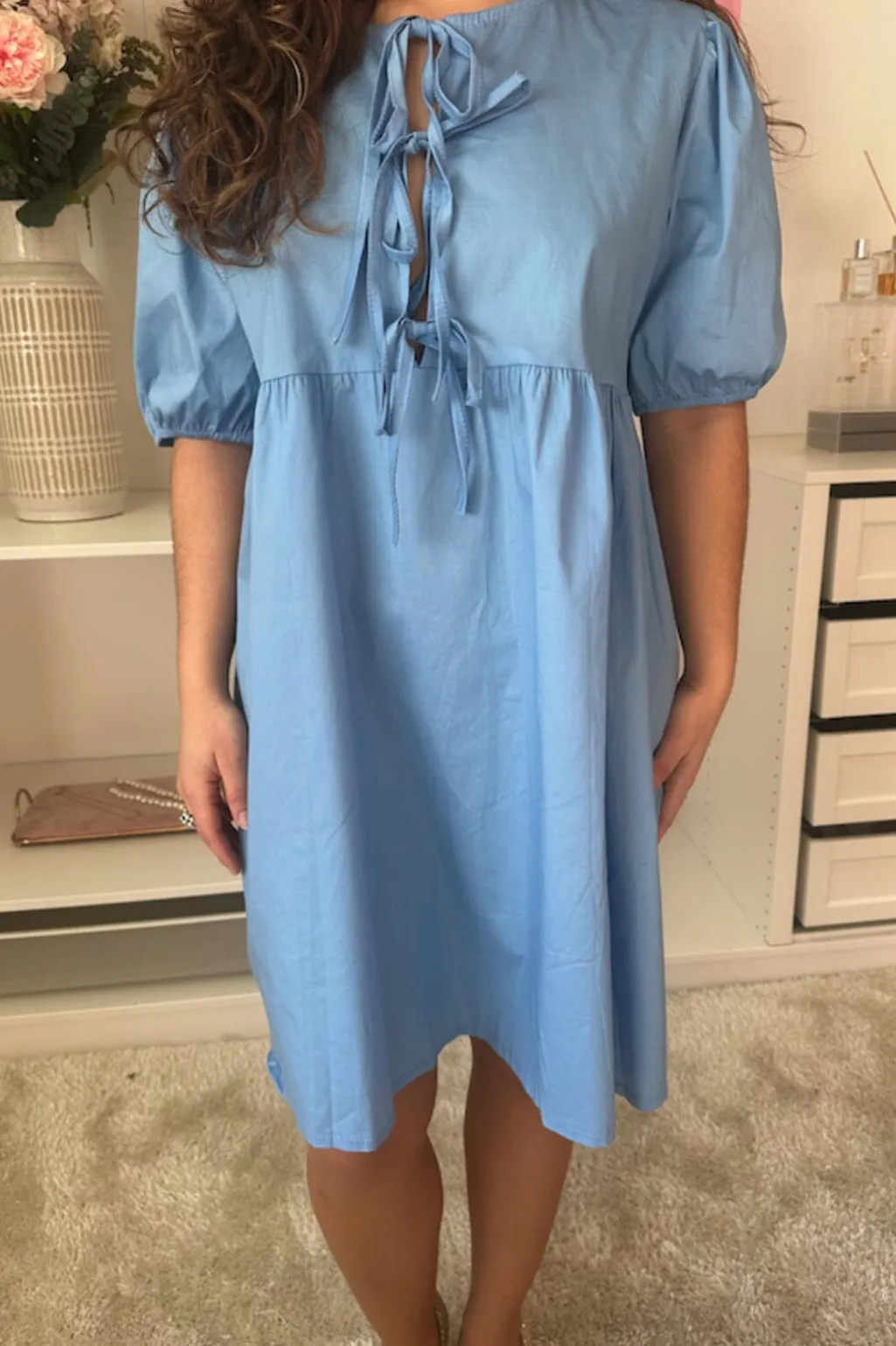 Himmelblå kjole fra A-bee med rund hals og bindedetalje. Kjolen har en afslappet pasform og puffede ærmer, der går til albuen. Stoffet falder blødt og naturligt.