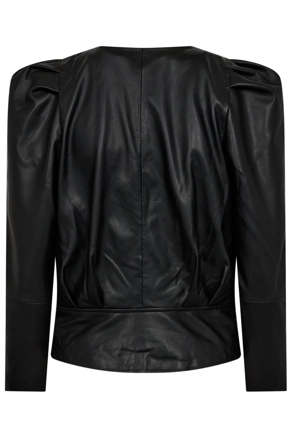 Sort læderbluse fra Co’couture med drapering og puffede ærmer. Blusen har en dyb V-udskæring og draperede detaljer, der skaber bevægelse i stoffet.
