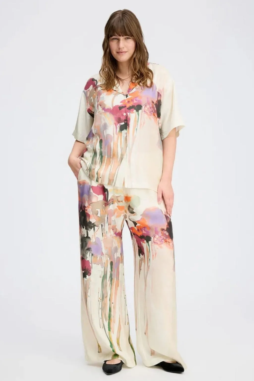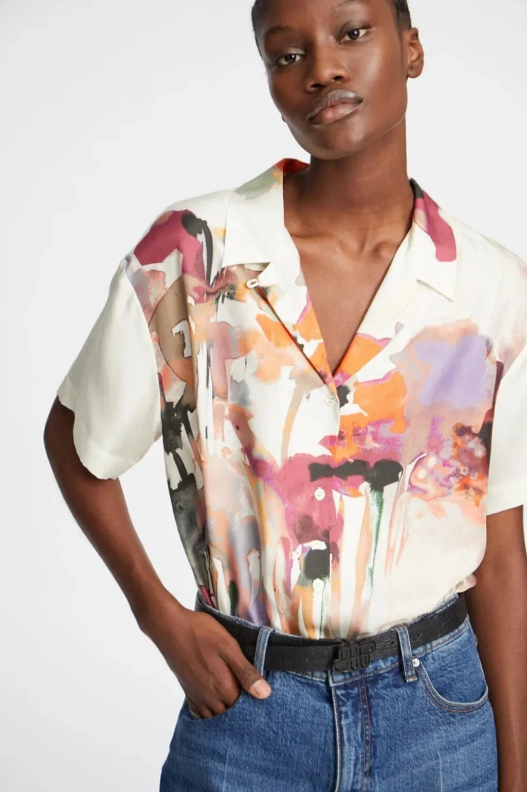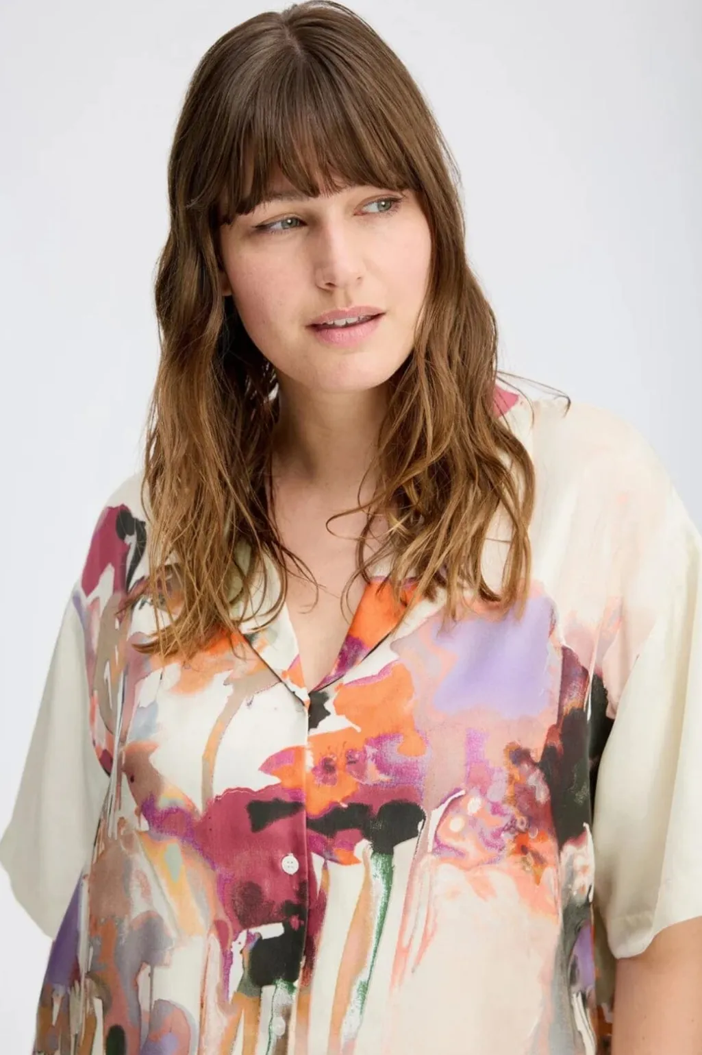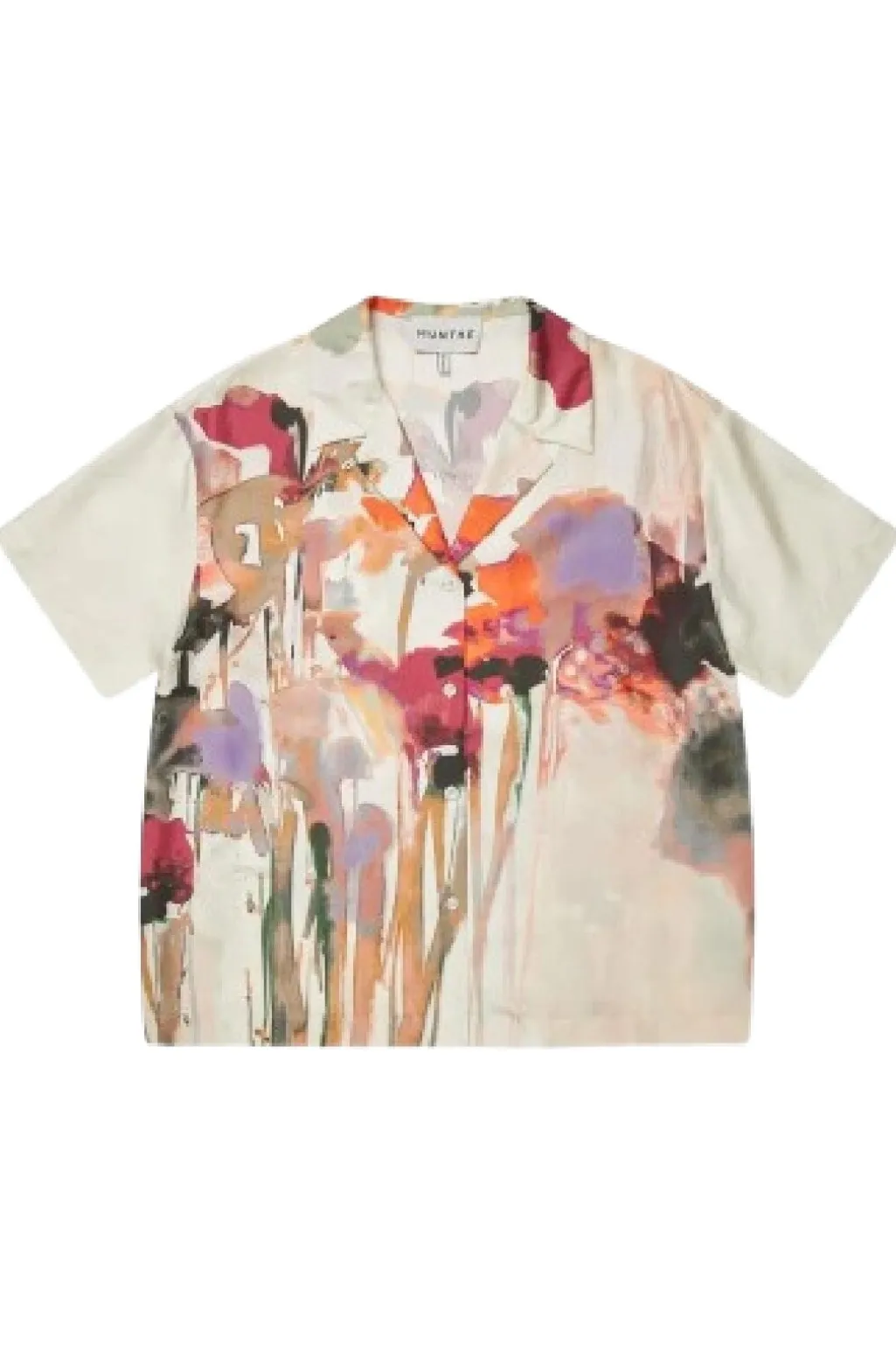 Sandfarvet skjorte fra Munthe med kunstnerisk blomsterprint i pink, orange og lilla nuancer. Skjorten har en løs pasform og er fremstillet i silke med korte ærmer og klassisk krave.
