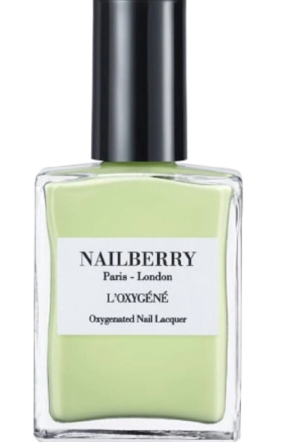 Lys, cremet grøn neglelak fra Nailberry med oxygeneret teknologi. Lakken har en holdbar finish og lader neglene ånde gennem produktet.
